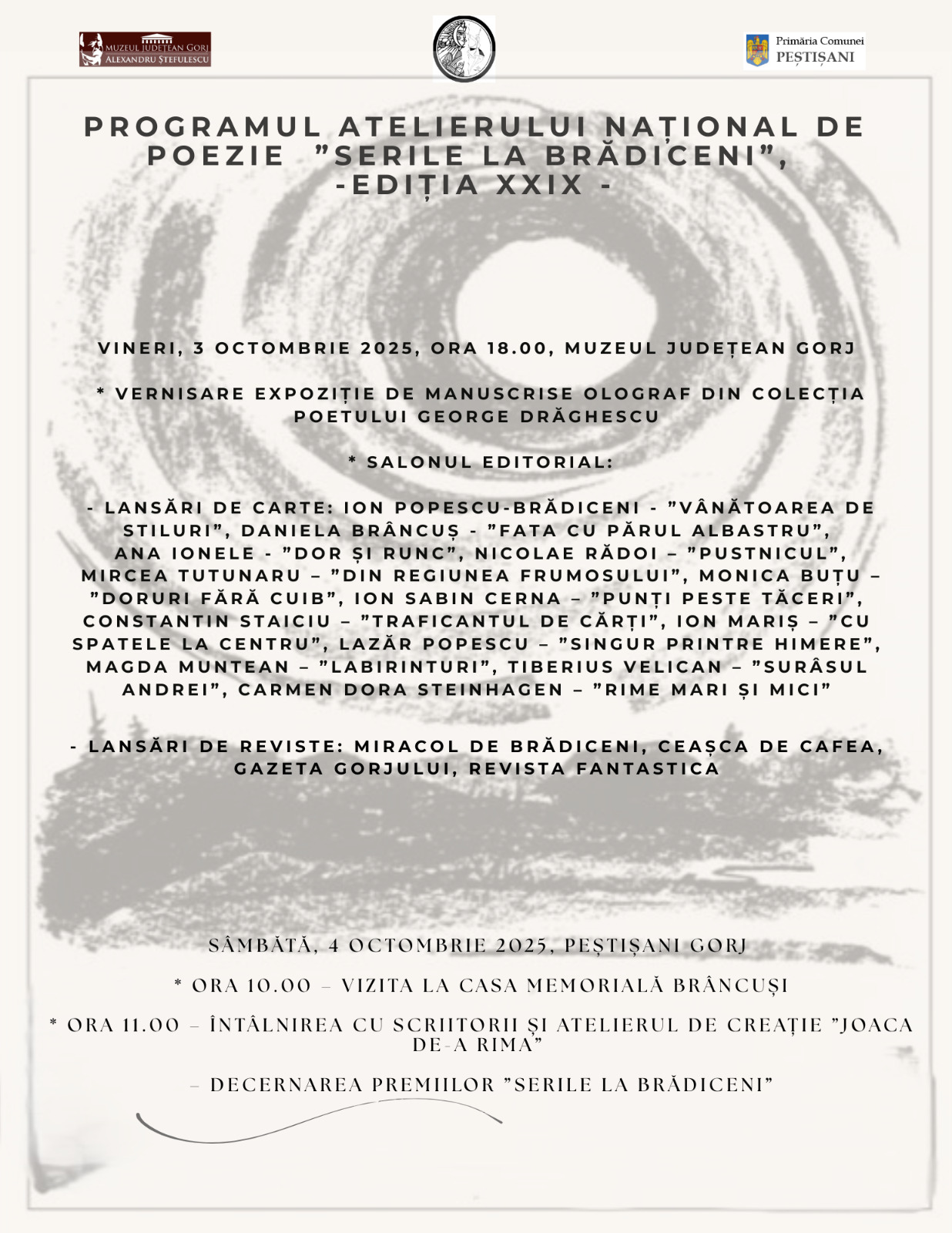 Centrul Județean pentru Conservarea și Promovarea Culturii Tradiționale Gorj, în parteneriat cu Muzeul Județean „Alexandru Ștefulescu” și cu sprijinul Primăriei și Consiliului Local Peștișani, organizează în perioada 3–4 octombrie 2025 o nouă ediție a Atelierului Național de Poezie „Serile la Brădiceni”, eveniment emblematic pentru cultura literară românească.