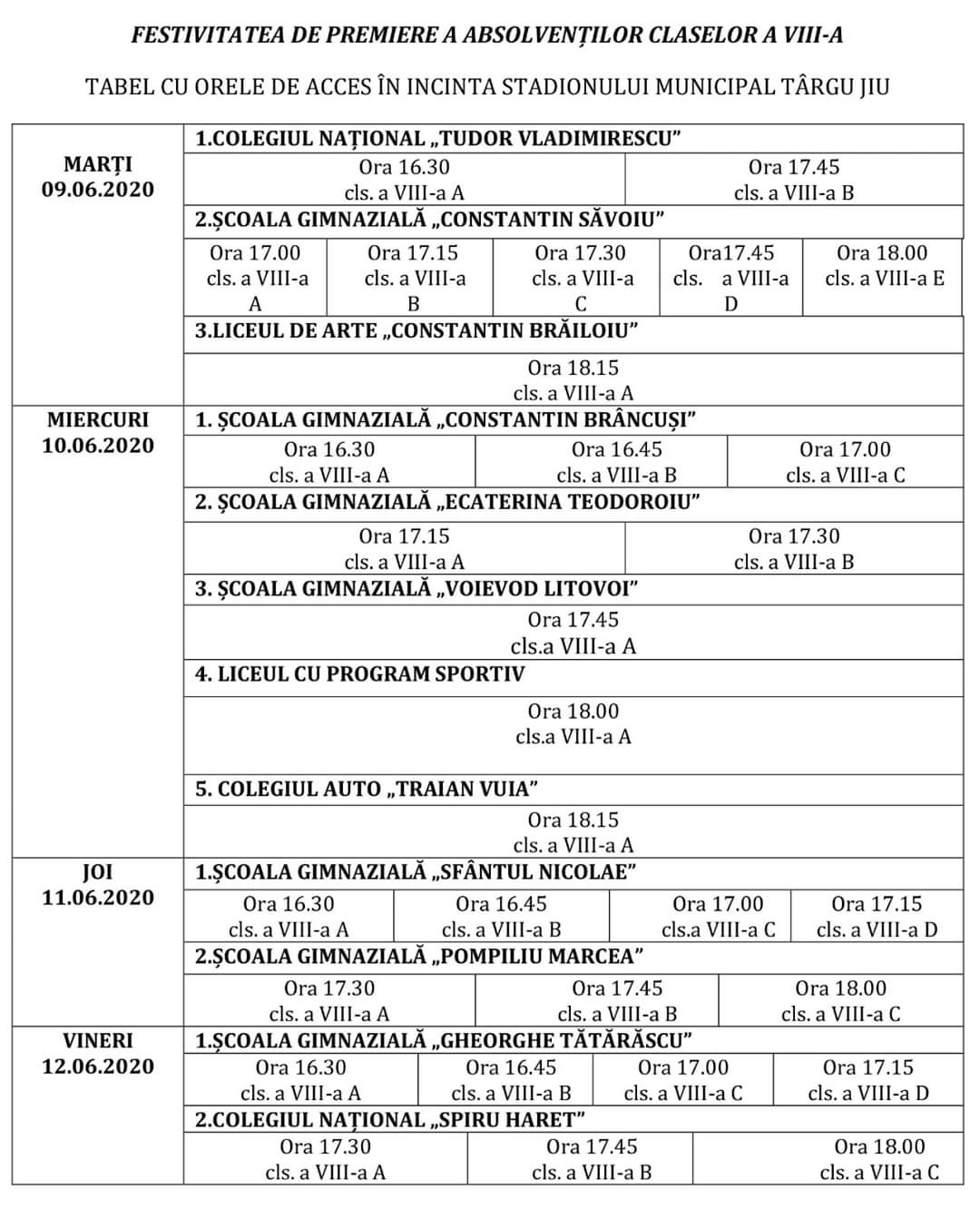 „Am stabilit astăzi, împreună cu directorii unităților de învățământ, programul festivităților organizate pentru absolvenții de gimnaziu din municipiului Târgu Jiu. Așa cum am mai menționat, am hotărât să le oferim absolvenților din învățământul gimnazial și liceal posibilitatea de a participa la o ceremonie organizată special pentru ei, în incinta Stadionului Municipal.