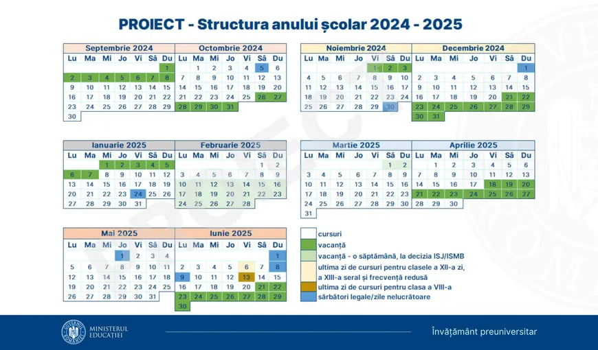 Proiectul mai prevede că pentru clasele a XII-a zi, a XIII-a seral şi frecvenţă redusă, anul şcolar are o durată de 34 de săptămâni de cursuri şi se încheie la data de 6 iunie 2025, iar pentru clasa a VIII-a, anul şcolar are o durată de 35 de săptămâni de cursuri şi se încheie la data de 13 iunie 2025.