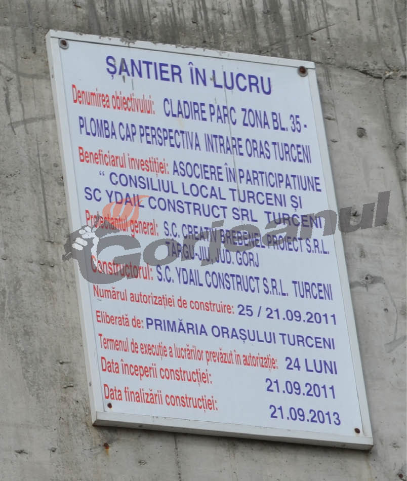 După o pauză de timp considerabilă, firma lui Ion Iordache de la Turceni, trecută în acte la unii apropiaţi, a reluat lucrările la proiectul “Clădire parc bloc 35(plombă cap intrare în oraş)”, realizat în parteneriat cu primăria din localitate. Lucrarea începuse în 2011, pe când Iordache era primar, şi trebuia să se finalizeze în septembrie 2013. Lucrarea este finalizată abia pe jumătate, abia recent firma intrând în posesia unei noi autorizaţii de construcţie. Cam patru, cinci muncitori lucrează la acest proiect care prevede realizarea unor spaţii comerciale în incinta clădirii.