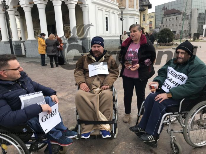 Câteva zeci de persoane au venit, vineri, în fața Prefecturii Gorj pentru a le transmite un semnal de alarmă guvernanților care în ultimele zile au tot lucrat la bugetul pe anul în curs. Au fost persoane cu dizabilități sau însoțitori ai acestora, toată lumea fiind îngrijorată că odată cu modificarea modalității de plată a indemnizațiilor, prin trecerea de bugetele locale, banii nu vor fi suficienți. Oricum sumele oferite de stat acestor persoane sunt unele foarte mici, fără ele oamenii fiind și mai loviți de soartă. “Am o fetiță de 15 ani cu o boală neurogenerativă și am venit aici alături de ceilalți părinți pentru că s-ar putea să rămânem și fără indemnizațiile pe care le primeam până acum. Copiii noștri au nevoi speciale, iar fără acest ajutor care oricum este mic nu știu ce ne vom face”, a spus o mamă, în timp ce un soț a mărturisit că în cazul său și soția și fetița au probleme speciale. “Fetița mea s-a născut cu nota 10, n-a avut probleme până la 2 ani și jumătate când i s-a făcut greșit un vaccin de poliomielită. De atunci are autism și așa a rămas până acum, la 13 ani. Am soția bolnavă de epilepsie de la 3 ani și jumătate, acum având 32 și cu o indemnizație de 375 de lei. Poate cineva trăi cu acești bani? Clar că nu! Fata mea are nevoi speciale, trebuie să fiu permanent cu ea, are un regim special de alimentație, dar lupt pentru ea că este copilul meu. Sunt tată și, deși e foarte greu, nu abandonez această luptă. Acum riscăm să rămânem și fără bruma aceasta măruntă de bani? La acești oameni nu se gândește nimeni?”, a spus bărbatul.