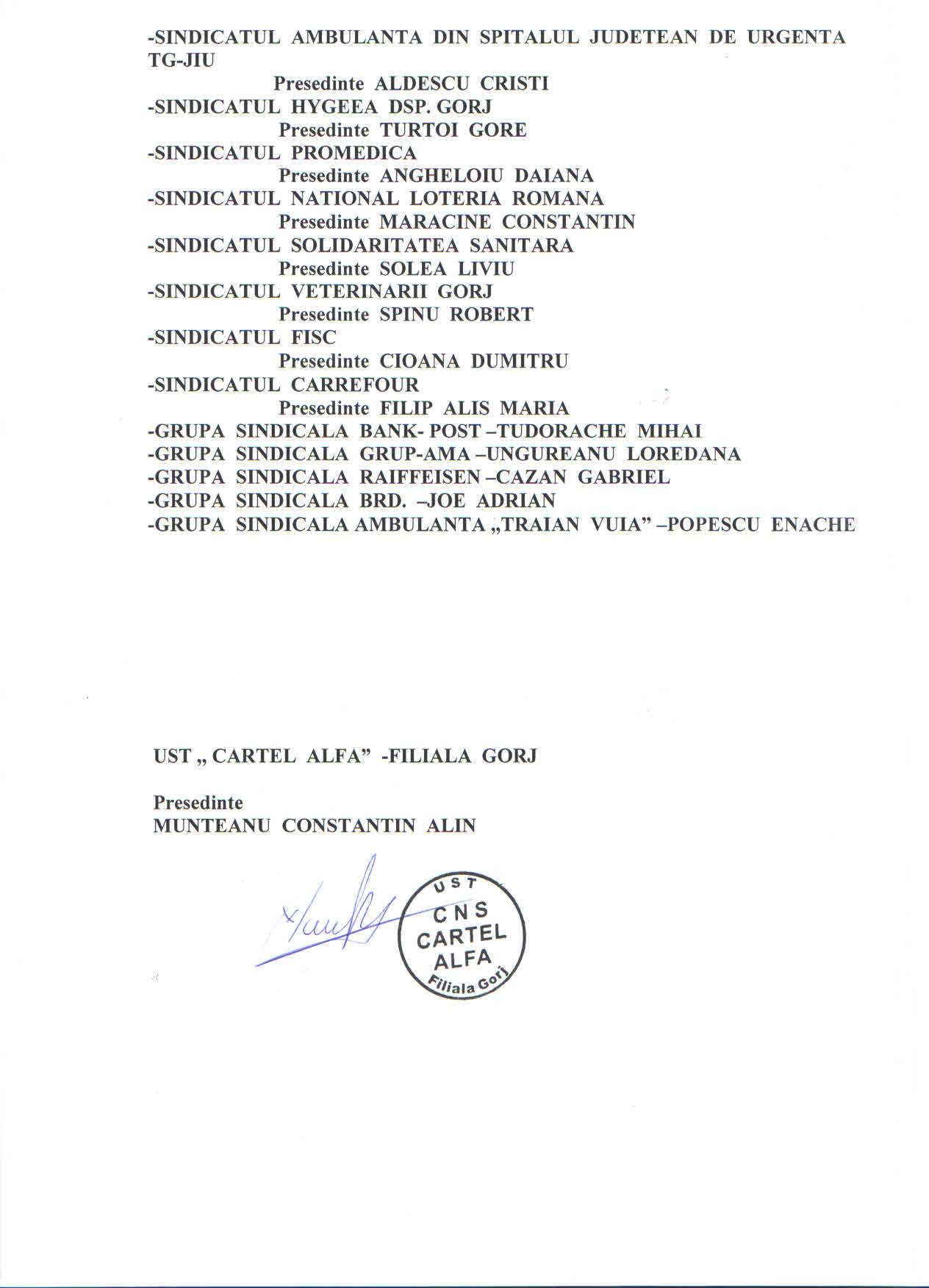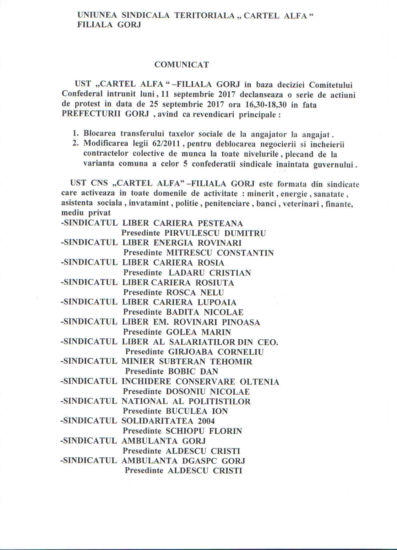 În baza deciziei Comitetului Confederal întrunit luni, UST Cartel Alfa Filiala Gorj anunță că va declanșa o serie de acțiuni de protest care vor avea loc luni, 25 septembrie 2017, între orele 16.30-18.30 în fața Prefecturii din Târgu-Jiu.