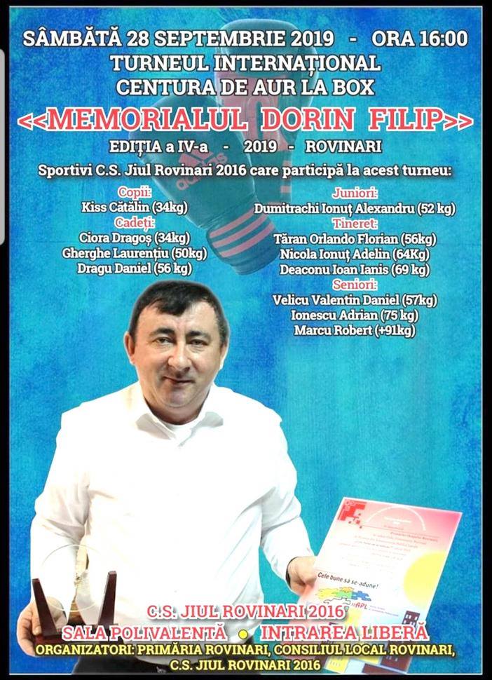 Oraşul Rovinari va fi, sâmbătă, gazda unei competiţii care a devenit tradiţie în România, Memorialul ,,Dorin Filip”. Întrecerea de box a ajuns la cea de-a patra ediţie, şi aduce la start cele mai puternice cluburi din ţară, dar şi sportivi de peste hotare. Turneul este organizat de Primăria oraşului Rovinari în colaborare cu Consiliul Local Rovinari şi CS Jiul Rovinari, şi va avea loc la Sala Polivalentă din localitate, sâmbătă 28 septembrie, cu începere de la ora 19.00. La competiţia internaţională de box vor lua parte cadeţi, juniori, tineri si seniori. Nu mai puţin de 11 pugilişti sunt legitimaţi la secţia de box a Clubului Sportiv Jiul Rovinari. Este vorba despre Cătălin Kiss în competiţia rezervată copiilor, Dragoş Ciora, Laurenţiu Gheorghe şi Daniel Dragu la cadeţi, Ionuţ Dumitrachi la juniori, Florin Tăran, Ionuţ Nicola şi Ioan Deaconu la tineret, precum şi Daniel Velicu, Adrian Ionescu şi Robert Marcu în competiţia pentru seniori. Intrarea în sală va fi liberă.