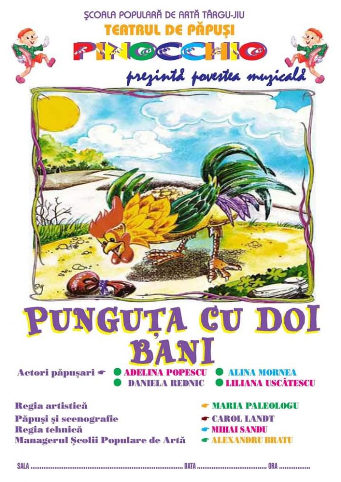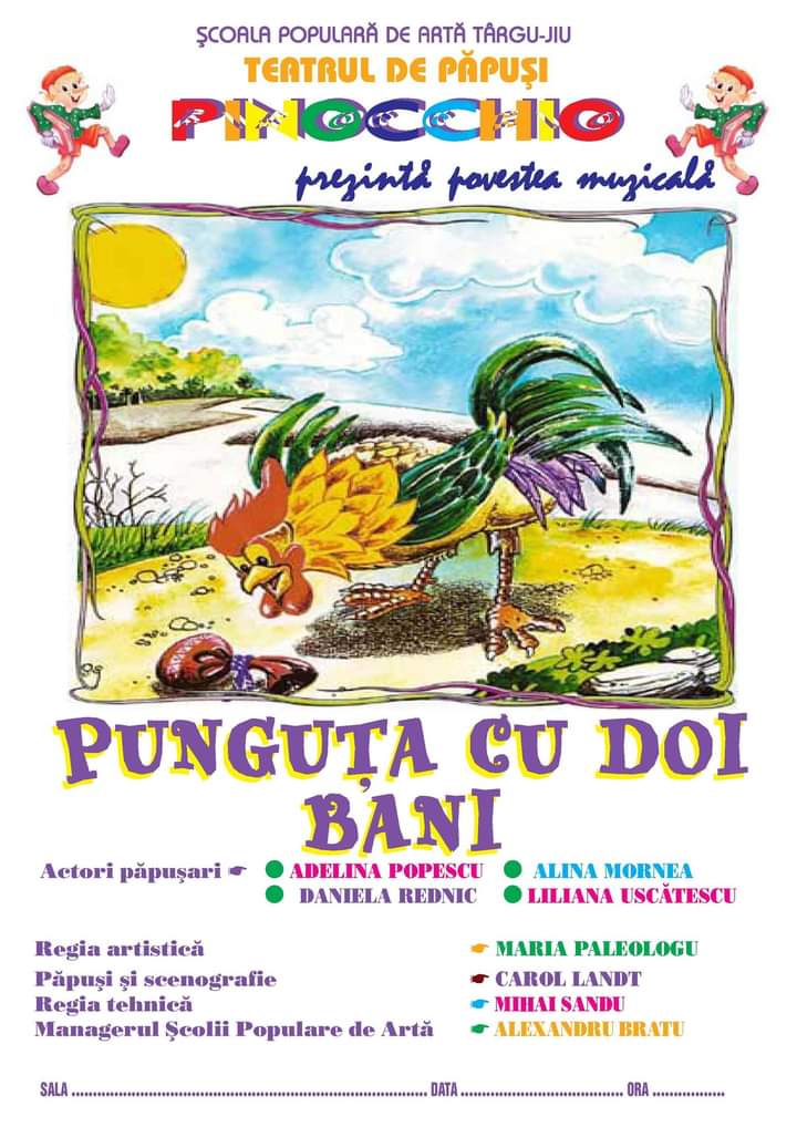 Teatrul de păpuși ”Pinocchio” revine cu piesa muzicală ”Punguța cu doi bani”. Aceasta se va juca miercuri, 19 august 2020, de la ora 10:30, la Teatrul de Vară din Târgu Jiu.