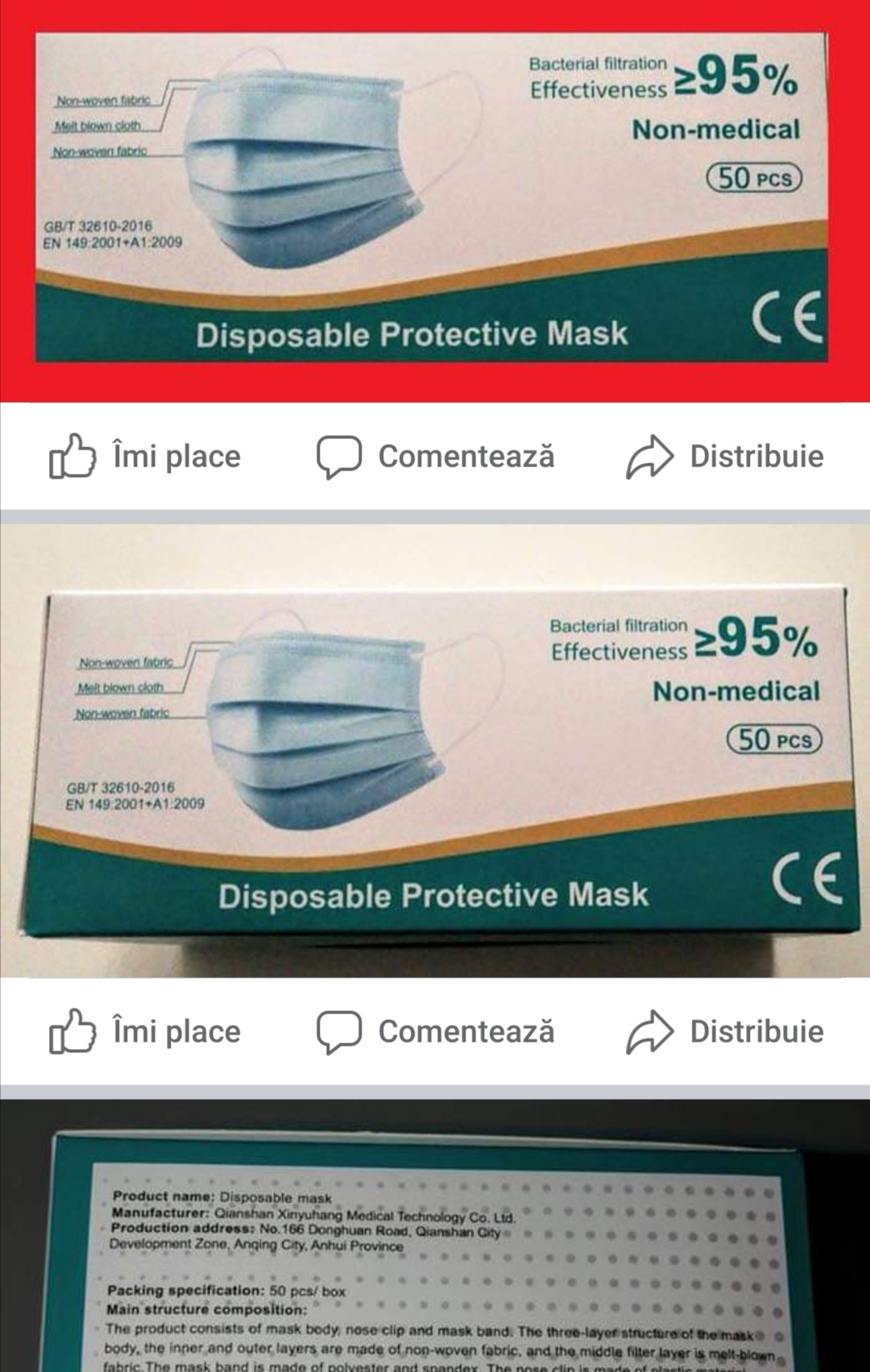 România a emis, prin sistemul RAPEX, o alertă pentru măşti neconforme aflate pe piaţă, care poartă marcajul CE, dar nu sunt certificate. Anunțul a fost făcut în această dimineaţa, pe Facebook, de către Paul Anghel, director general în cadrul Autorităţii Naţionale pentru Protecţia Consumatorilor (ANPC): „Alertă emisă de România-RAPEX: Produsul poartă marcajul CE, dar nu este certificat ca echipament de protecție de către un organism competent.Prin urmare, este posibil ca produsul să nu îndeplinească cerințele în materie de sănătate și siguranță și, prin urmare, să nu fie protejat în mod corespunzător în cazul în care nu este combinat cu măsuri suplimentare./produsul/produsul nu respectă Regulamentul privind echipamentele individuale de protecție și standardul european relevant EN 149”.