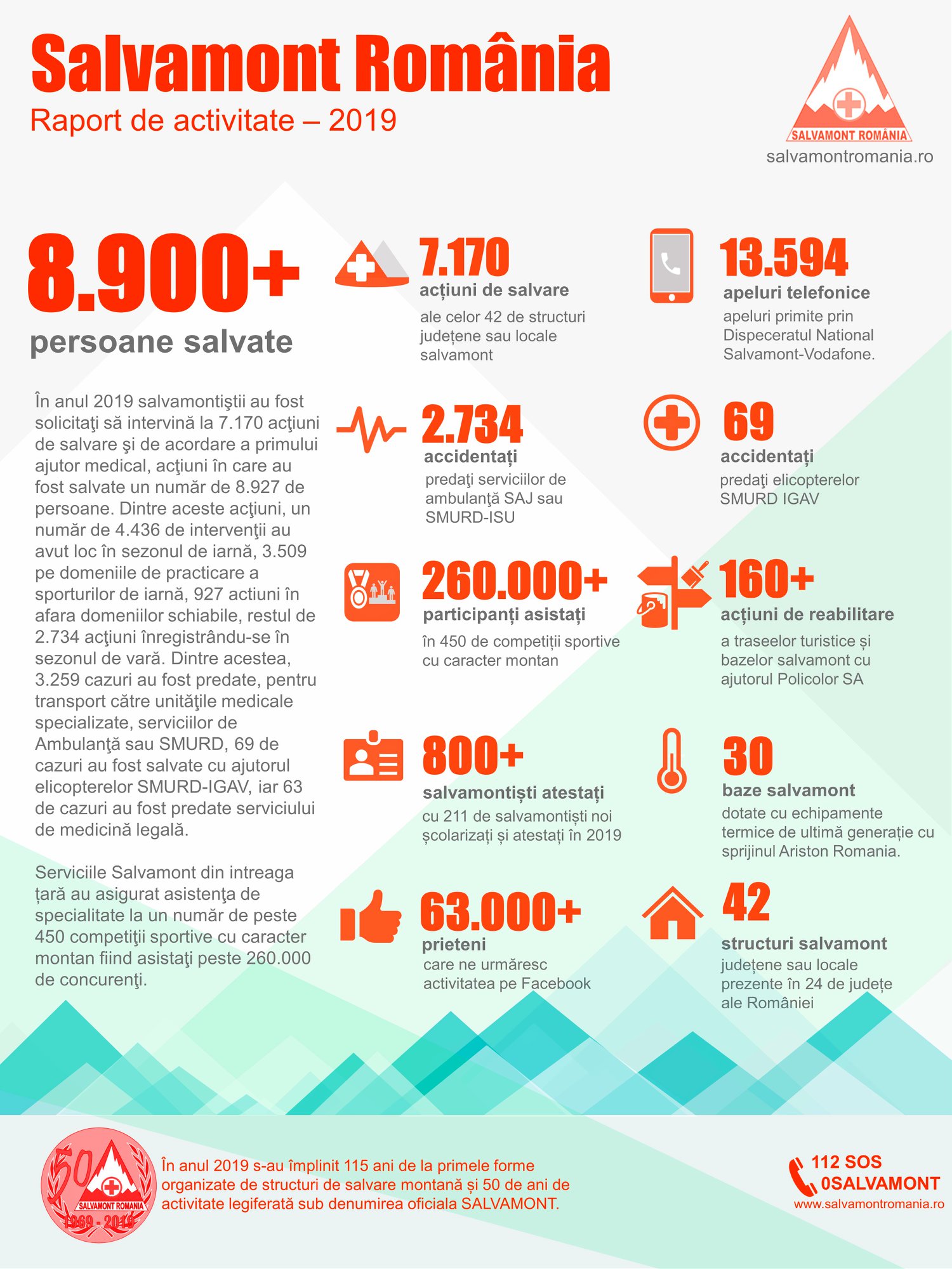 Asociația Națională a Salvatorilor Montani din România și Consiliul Serviciilor Publice Salvamont au centralizat activitatea a celor 42 de structuri județene sau locale salvamont din cele 24 de județe cu activitate de salvare montană din România pentru anul 2019. În perioada de referință serviciile publice județene și locale Salvamont au asigurat asistența de salvare montană cu un număr de 400 – 550 de salvamontiști, zilnic, în cele cca 130 de baze și posturi salvamont permanente sau sezoniere, în zonele montane cu afluență turistică mare, pe pârtiile de practicare a sporturilor de iarnă și pe traseele turistice alpine, structurile Salvamont fiind solicitate să intervină la 7.170 (+21,1% creștere față de anul 2018) acțiuni de salvare și de acordare a primului ajutor medical, acțiuni în care au fost salvate un număr de 8.927 (+ 26,33%) de persoane. Dintre aceste acțiuni, un număr de 4.436 (+ 17,05% ) de intervenții au avut loc în sezonul de iarnă, 3.509 (+11,6%) pe domeniile de practicare a sporturilor de iarnă, 927(+43,49%) acțiuni iarna, în afara domeniilor schiabile, restul de 2.743 (+28,83%) acțiuni înregistrându-se în sezonul de vară. Din numărul total de intervenții, 3.259(+38,21%) cazuri au fost predate, pentru transport către unitățile medicale specializate, serviciilor de Ambulanță sau SMURD, 69(+79,90%) de cazuri au fost salvate cu ajutorul elicopterelor SMURD-IGAV, iar 63(+65,78%) de cazuri au fost predate serviciului de medicină legală. În perioada de referință structurile Salvamont au intervenit și la 108 evenimente produse în afara zonei montane, ca resursă de sprijin sau echipă de prim răspuns, precum și la 42 de evenimente montane, ca resursă de sprijin sau în locul altor structuri care nu au avut capacitatea de a interveni sau de a-și soluționa singure acțiunile pentru care erau responsabile. Trebuie remarcat faptul ca structurile Salvamont avut un grad de răspuns de 100% la solicitările specifice domeniului de activitate, doar cu resursele proprii, acest lucru confirmând că acestea sunt organizate corespunzător, își dimensionează corect și își dezvoltă permanent resursele umane și materiale. De asemenea, au fost realizate peste 80.000 de acțiuni specifice de asigurarea a asistenței de salvare montană în bazele, posturile, refugiile salvamont, în zonele cu aflux turistic mare sau pe perioada desfășurării unor evenimente sportive sau de alta natură în zona montană.
