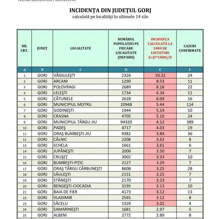Comuna Văgiulești a depășit 10 cazuri de Covid-19 la mia de locuitori, potrivit DSP Gorj. Iar în alte patru comune a fost depășit pragul de 6. Este vorba de Arcani, Polovragi, Lelești și Cătunele.