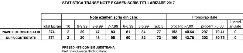 Rata de promovare a examenului de titularizare a crescut cu 2.14 procente după reevaluarea lucrărilor contestate, astfel încât 42,78 % dintre candidaţi (160) au obţinut note egale sau mai mari de 7, în județul Gorj. Rezultatele finale s-au afişat, ieri, la sediul Inspectoratului Școlar Judeţean şi pe site-ul Ministerului Educației. Au existat și candidaţi care au primit note mai mici, după ce au depus contestaţii, iar lucrările lor au fost, din nou, analizate.