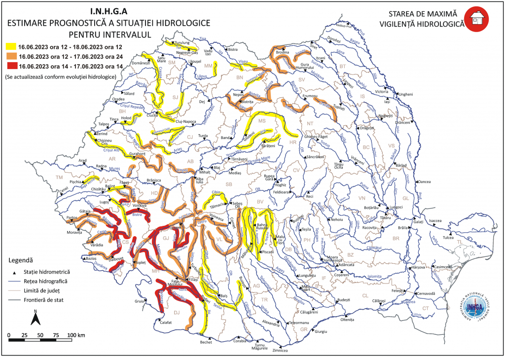 În intervalul 16.06.2023 ora 12:00 – 18.06.2023 ora 12:00 pe râurile din bazinele hidrografice: Vişeu – bazin superior şi afluenţi bazin mijlociu şi inferior, Iza – bazin superior şi afluenţi bazin mijlociu şi inferior, Lăpuş – bazin superior şi afluenţi bazin mijlociu şi inferior (judeţul Maramureş), Tur (judeţul Satu Mare), Someşul Mare – bazin superior şi afluenţi bazin mijlociu şi inferior (judeţul Bistriţa Năsăud), Someşul Mic – bazin superior şi afluenţi bazin mijlociu şi inferior (judeţele: Bihor şi Cluj), Someş – afluenţii mici aferenţi sectorului aval S.H. Dej (judeţele: Cluj, Sălaj, Maramureş şi Satu Mare), Crasna (judeţele: Sălaj şi Satu Mare), Barcău – bazin superior şi afluenţi bazin mijlociu şi inferior (judeţele: Sălaj şi Bihor), Crişul Repede – bazin superior şi afluenţi bazin mijlociu şi inferior (judeţele: Cluj şi Bihor), Crişul Negru – bazin amonte S.H. Beiuş şi afluenţii aferenţi sectorului aval S.H. Beiuş (judeţele: Bihor şi Arad), Crişul Alb (judeţele: Hunedoara şi Arad), Mureş – bazin amonte S.H. Glodeni, Niraj (judeţele: Harghita şi Mureş), Arieş – bazin amonte S.H. Baia de Arieş şi afluenţii aferenţi sectorului aval S.H. Baia de Arieş (judeţele: Alba şi Cluj), Mureş – afluenţii aferenţi sectorului aval confluenţă cu râul Arieş – amonte confluenţă cu râul Târnava (judeţele: Alba şi Cluj), Târnava Mică – bazin superior şi afluenţi bazin mijlociu şi inferior (judeţele: Harghita, Mureş şi Alba), Mureş – afluenţii aferenţi sectorului aval confluenţă cu râul Târnava (judeţele: Alba, Hunedoara, Sibiu şi Arad), Bega Veche – bazin superior şi afluenţi bazin mijlociu şi inferior, Bega – bazin amonte S.H. Balinţ şi afluenţii aferenţi sectorului aval S.H. Balinţ – amonte S.H. Remetea (judeţul Timiş), Timiş – bazin amonte S.H. Lugoj, Pogăniş – bazin amonte Ac. Cadar Duboz, Bârzava, Moraviţa (judeţele: Caraş Severin şi Timiş), Caraş, Nera (judeţul Caraş Severin), Cerna (judeţele: Gorj şi Caraş Severin), Dunăre – afluenţii mici aferenţi sectorului amonte confluenţă cu râul Desnăţui (judeţele: Dolj, Mehedinţi şi Caraş Severin), Desnăţui (judeţele: Mehedinţi şi Dolj), Jiu (judeţele: Hunedoara, Gorj, Mehedinţi şi Dolj), Olt – afluenţii aferenţi sectorului aval S.H. Sebeş Olt (judeţele: Sibiu, Vâlcea, Gorj, Argeş, Olt şi Dolj), Argeş – bazin superior (judeţul Argeş), Dâmboviţa – bazin superior (judeţele: Argeş şi Dâmboviţa), Suceava – bazin superior şi afluenţi bazin mijlociu şi inferior (judeţul Suceava), Moldova – bazin superior şi afluenţi bazin mijlociu şi inferior (judeţele: Suceava şi Neamţ), Bistriţa – bazin amonte S.H. Cârlibaba şi afluenţii aferenţi sectorului aval S.H. Cârlibaba – amonte S.H. Frunzeni (judeţele: Suceava, Neamţ şi Harghita).