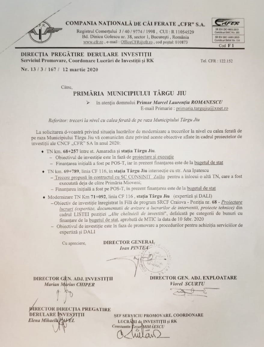 ,,Este vorba despre trecerile din strada Amaradia (zona fostei Avicola), cea din strada Ana Ipătescu și cea de pe strada Tudor Vladimirescu. În urma discuțiilor pe care le-am purtat anul trecut cu ministrul Transporturilor, Lucian Bode, dar și a numeroaselor demersuri pe care le-am făcut către societatea de transport feroviar, cele trei obiective se regăsesc în proiectele de investiții ale CNCF ,,CFR” SA în anul 2020”, a anunțat Romanescu.