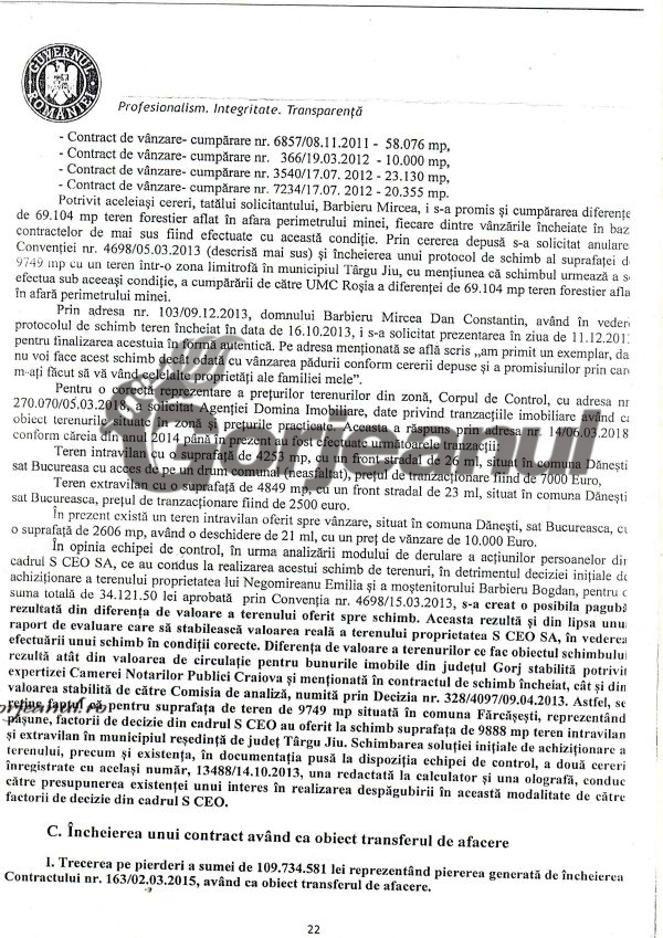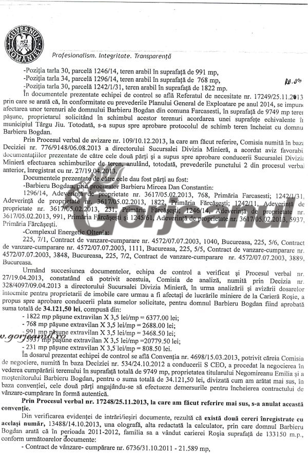 cereri, tatălui solicitantului, Barbieru Mircea, i s-a promis şi cumpărarea diferenţei de 69.104 mp teren forestier aflat în afara perimetrului minei, fiecare dintre vânzările încheiate în baza contractelor de mai sus fiind efectuate cu această condiţie. Prin cererea depusă s-a solicitat anulare Convenţiei nr. 4698/05.03.2013 (descrisă mai sus) şi încheierea unui protocol de schimb al suprafaţei de 9749 mp cu un teren într-o zonă limitrofă în municipiul Târgu-Jiu, cu menţiunea că schimbul urmează a se efectua sub aceeaşi condiţie, a cumpărării de către UMC Roşia a diferenţei de 69.104 mp teren forestier aflat în afara perimetrului minei” spun verificatorii, care consideră că s-a creat o pagubă CEO, rezultată din diferenţa de valoare a terenului oferit spre schimb. Paguba rezultă şi din lipsa unui raport de evaluare care să stabilească valoarea reală a terenului proprietatea