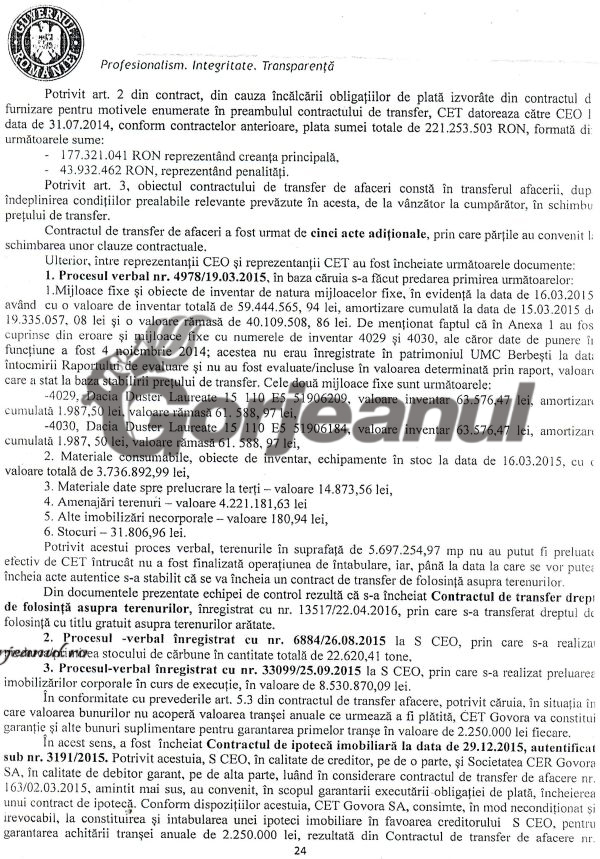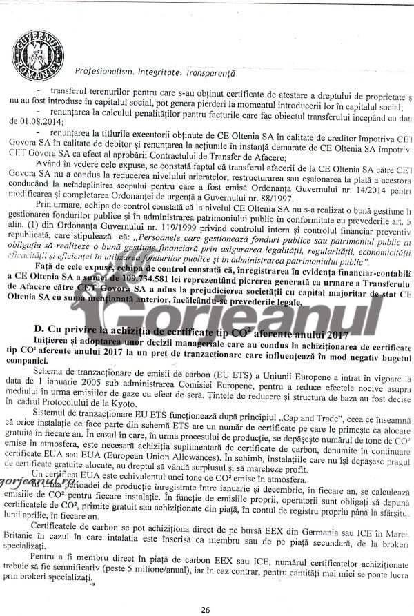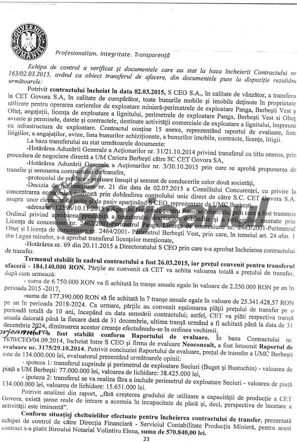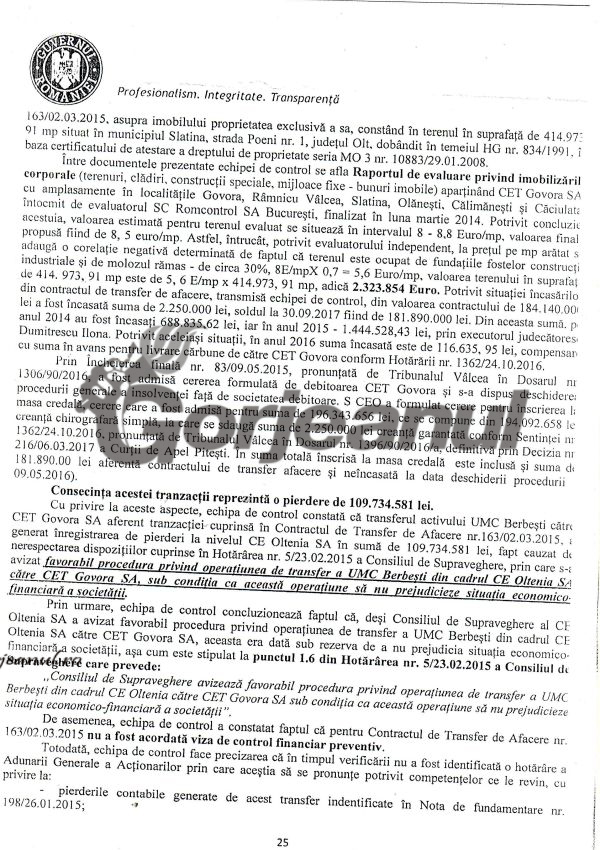 a transferat la CET Govora S.A, în calitate de cumpărător, toate bunurile mobile şi imobile deţinute în proprietate utilizate pentru operarea carierelor de exploatare minieră-perimetrele de exploatare Panga, Berbeşti Vest şi Olteţ, angajaţii, licenţa de exploatare a lignitului, perimetrele de exploatare Panga, Berbeşti Vest si Olteţ avizele şi permisele, datele şi contractele destinate activităţii comerciale de exploatare a lignitului, împreună cu infrastructura de exploatare. Contractul conţine 15 anexe, reprezentând raportul de evaluare a angajaţilor, avize, lista bunurilor achiziţionate, a bunurilor imobile, contracte, licenţe, litigii. Termenul stabilit în cadrul contractului a fost 26.03.2015, iar preţul convenit pentru transferul afacerii a fost de 184.140.000 RON. Părţile au convenit că CET Govora va achita valoarea totală a preţului de transfer, după cum urmează: suma de 6.750.000 RON va fi achitată în tranşe anuale egale în valoare de 2.250.000 RON pe an în perioada 2015 -2017, iar suma de 177.390.000 RON să fie achitată în 7 tranşe anuale egale în valoare de 25.341.428,57 RON pe an în perioada 2018-2024. Ca urmare, părţile au convenit eşalonarea plăţii preţului de transfer pe o perioadă totală de 10 ani, începând cu data semnării contractului; astfel, CET va plăti respectiva tranşă anuală datorată până la fiecare dată de 31 decembrie, ultima tranşă urmând a fi achitată până la data de 31 decembrie 2024, diminuarea acestor creanţe efectuându-se în ordinea vechimii. În 2016, CET Govora a intrat în insolvență, iar compania are și acum de recuperat de la aceasta 109.734.581 lei. “Având în vedere cele expuse, se constată faptul că transferul afacerii de la CE Oltenia SA către CET Govora SA nu a condus la reducerea nivelului arieratelor, restructurarea sau eşalonarea la plată a acestora conducând la neîndeplinirea scopului pentru care a fost emisă Ordonanţa Guvernului nr. 14/2014 pentru modificarea şi completarea Ordonanţei de urgenţă a Guvernului nr. 88/1997. Prin urmare, echipa de control constată că la nivelul CE Oltenia SA nu s-a realizat o bună gestiune în gestionarea fondurilor publice şi în administrarea patrimoniului public în conformitate cu prevederile art. 5 alin. (1) din Ordonanţa Guvernului nr. 119/1999 privind controlul intern şi controlul financiar preventiv republicată, care stipulează că: ,,Persoanele care gestionează fonduri publice sau patrimoniul public au obligaţia să realizeze o bună gestiune financiară prin asigurarea legalităţii, regularităţii, economicităţii, eficacităţii și eficienţei în utilizarea fondurilor publice şi în administrarea patrimoniului public”. Faţă de cele expuse, echipa de control constată că, înregistrarea în evidenţa financiar-contabilă a CE Oltenia SA a sumei de 109.734.581 lei reprezentând pierderea generată ca urmare a Transferului de Afacere către CET Govora SA a adus la prejudicierea societăţii cu capital majoritar de stat CE Oltenia SA cu suma menţionată anterior, încălcându-se prevederile legale”, prevede raportul de control. Concluziile, după cele două spețe analizate de Corpul de Control al Ministerului Energiei, arată clar că atât actuala administrație, cât și fosta condusă de Laurențiu Ciurel au greșit. Până în prezent însă nimeni nu a fost tras la răspundere pentru cele sesizate de verificatori, mai mult neregulile fiind, în continuare, ignorate.