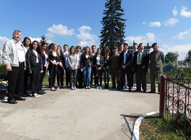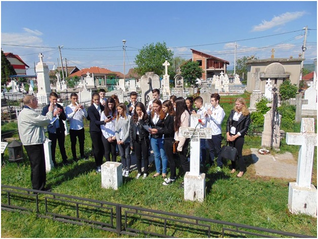 După cuvenita fotografie de grup, ne deplasăm la mormântul Eroului slt. p.m. Haidău Grigore Cătălin, căzut la datorie în Decembrie 1989, fiul profesorului Grigore Haidău. Acelaşi ritual: pănglicuţa e nouă, a fost schimbată de curând de către tatăl său, dar două garoafe prinse de două eleve, vor sta bine acolo. Cântăm Imnul „Bravi Eroi !”: