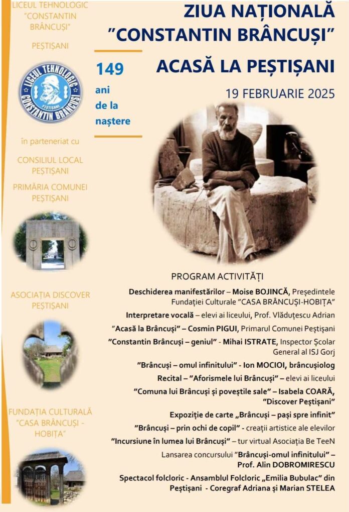 Peștișani, localitatea natală a marelui sculptor Constantin Brâncuși, va fi din nou gazda unor manifestări culturale deosebite dedicate uneia dintre cele mai mari personalități ale artei românești și mondiale. Mâine, 19 februarie, cu prilejul Zilei Naționale ”Constantin Brâncuși”, comuna va deveni locul în care tradiția și respectul pentru moștenirea culturală vor fuziona în evenimente deosebite, menite să păstreze vie memoria și geniul acestui simbol național.
