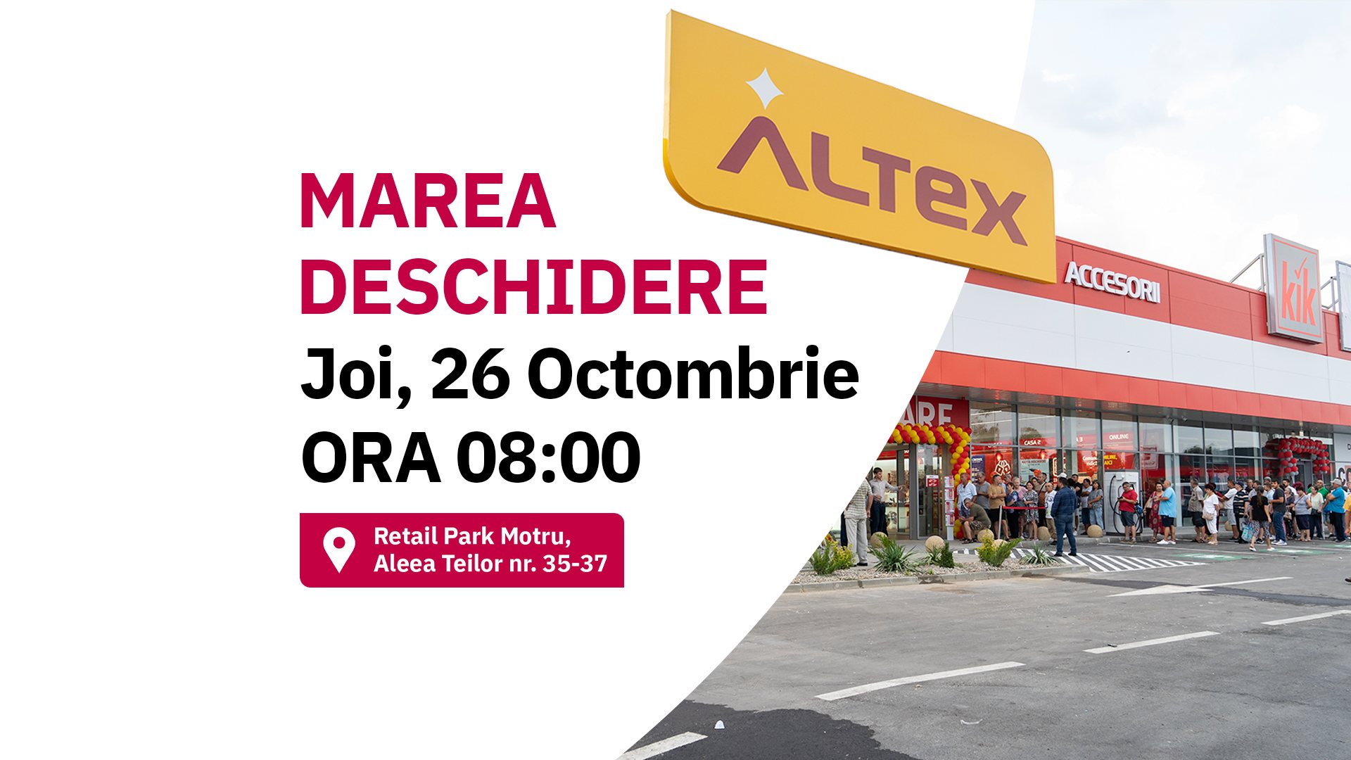 Retailerul de electronice și electrocasnice Altex România deschide un nou magazin la nivelul județului Gorj. Acesta se va inaugura săptămâna viitoare, pe 26 octombrie, în municipiul Motru, de la ora 08:00. Ziua deschiderii se anunță a fi una plină de surprize pentru cumpărătorii care vor trece pragul magazinului.