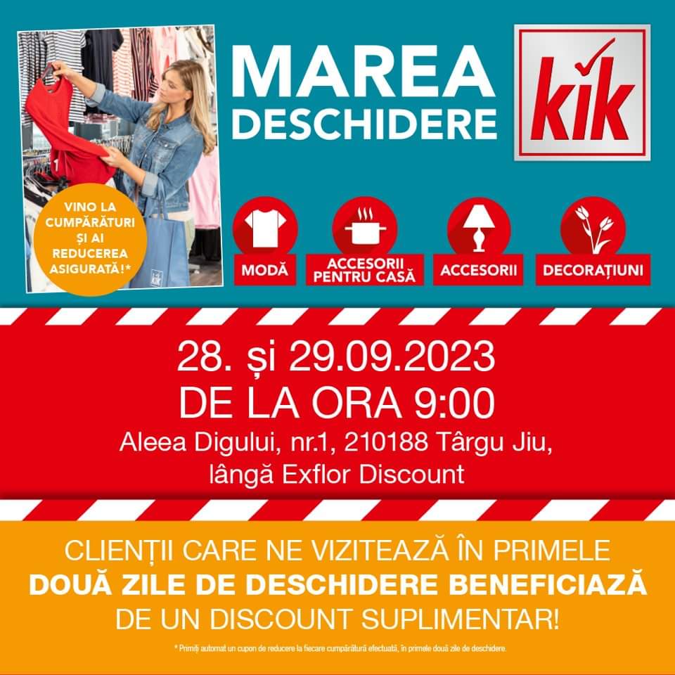 Pe 28 septembrie, la ora 09:00, retailerul KiK inaugurează magazinul de la Târgu Jiu. „Ne vedem pe 28 septembrie la deschiderea magazinului KiK din oraș! Am pregătit toată gama de produse calitative la prețuri accesibile pentru acest sezon. Te așteptăm să le descoperi în magazinul de pe Aleea Digului, nr.1, 210188 Târgu Jiu, lângă Exflor Discount. În plus, primii 1.500 de clienți primesc automat un cupon de reducere la fiecare achiziție efectuată, în primele două zile de la deschidere”, au anunțat reprezentanții KiK.