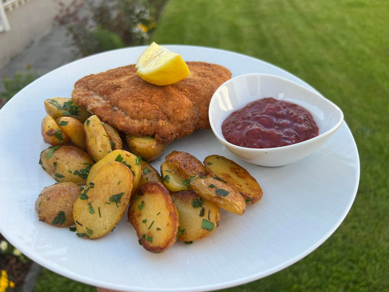 cordon blue, alături de cartofi, o felie de lămâie și dacă doriți cu o lingură de marmeladă de merișoare.