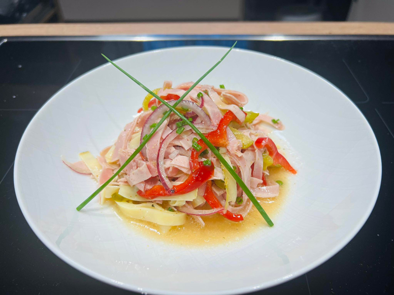 Tăiem șunca și brânza în felii subțiri de 1 cm.