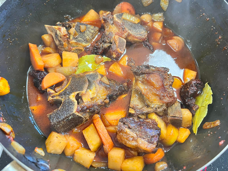 Este momentul să stingem cu vin sau, mai exact, cuvântul potrivit din limba franceză este ,,deglacieren “. După ce am stins cu vin lăsăm ca acesta să se reducă. Dacă doriți ca sosul să fie bun și închis la culoare, acest procedeu de ,,deglacieren “ se poate efectua de 3 ori. Ideea este să nu lăsam să reducem vinul de tot. Adăugăm mirodeniile, verdeața, apoi turnăm supa clară de legume sau apa și fierbem totul pentru cel puțin 3 ore la temperatură mică.