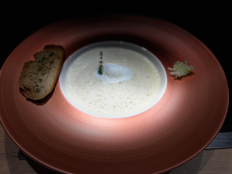 Înainte să ajungă la punctul de fierbere, mixăm cu blenderul de mână, mixăm laptele până se formează o spumă consistentă. Servim supa cremă alături de chipsuri din pâinea de secară, gulii brunoaise și spumă de lapte.