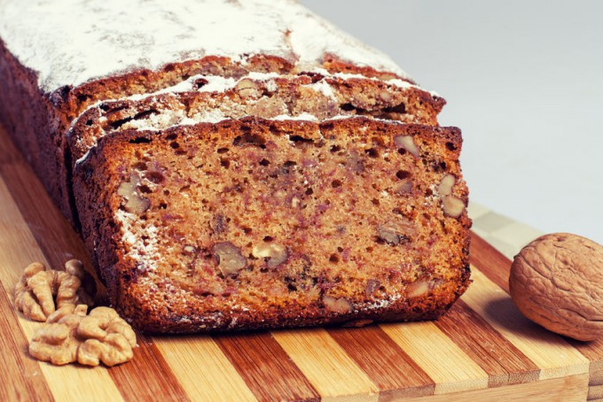 Ingrediente: 500 g făină, 300 g zahăr, 2 linguri praf de copt, 1 linguriță bicarbonat, 1 fiolă esență de rom, 10 linguri ulei floarea soarelui, 1 1/2 cană apă, 1 cană nuci mărunțite, zahăr pudră pentru ornat