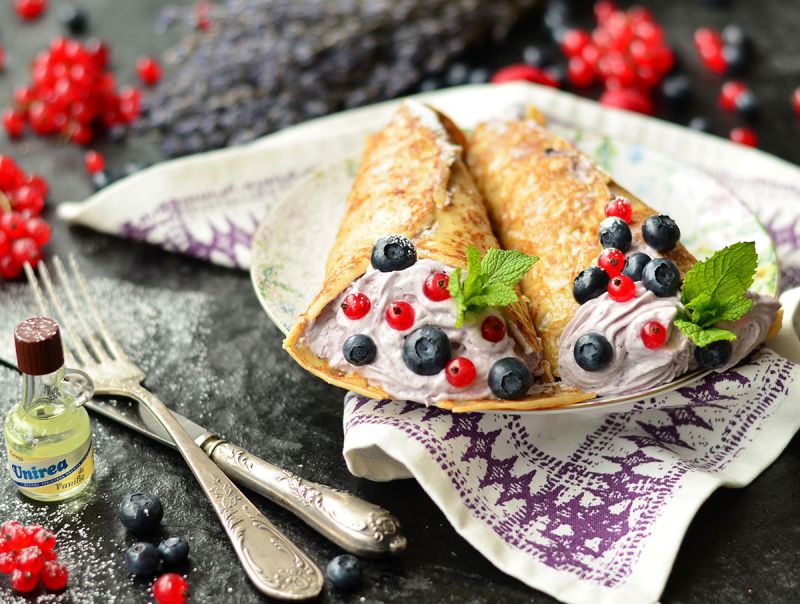 Se umple fiecare clătită, rulând-o sub forma unui con de înghețată. Se decorează cu afine şi mentă.