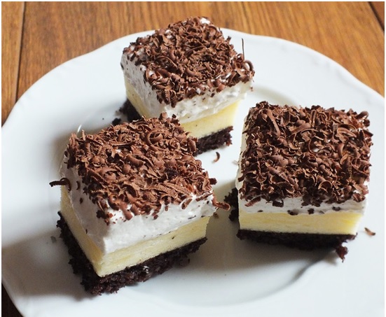 Pentru blat, se mixează gălbenușurile cu zahărul. Se adaugă apa, praful de copt (nestins), zahărul vanilinat, făina și cacaua. Se pregătește o tavă cu dimensiunile de 35×27 cm. Se tapetează cu hârtie cerată și se unge cu unt. Se toarnă compoziția pentru blat în tavă. Se întinde compoziția uniform. Blatul va crește frumos.Se coace blatul pentru 15-20 minute la foc potrivit. Nu trebuie să fie copt definitiv. Între timp se pregătește crema. Se bat spumă albușurile cu un praf de sare până când se obține o bezea tare. Se încorporează treptat zahărul pudră. Se pune 2/3 din apă, într-o crăticioară, la fiert. Se dizolvă budinca de vanilie în 1/3 de apă rece. Când apa din crăticioară începe să fiarbă, se adaugă budinca dizolvată. Se fierbe pe foc pentru 3-4 minute. Se încorporează albușurile bătute spumă cu budinca din cratiță, încă fierbinte. Se scoate blatul din cuptor și se distribuie uniform crema deasupra. Se pune tava în cuptor pentru încă 15 minute, la foc mediu spre mic. Când prăjitura se răcește, se pune frișca și ciocolata răzuită.