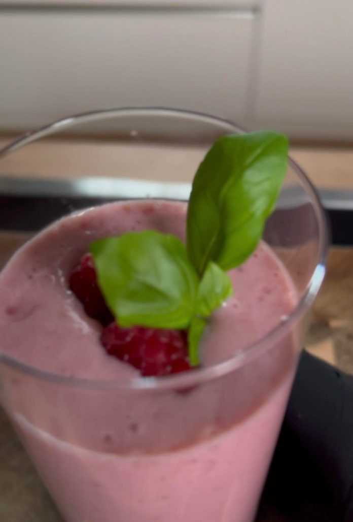 Adăugăm restul ingredientelor în blender și apoi amestecăm totul bine, pentru aproximativ un minut. După bunul plac, se poate ornamenta cu zmeură, mentă sau busuioc verde.