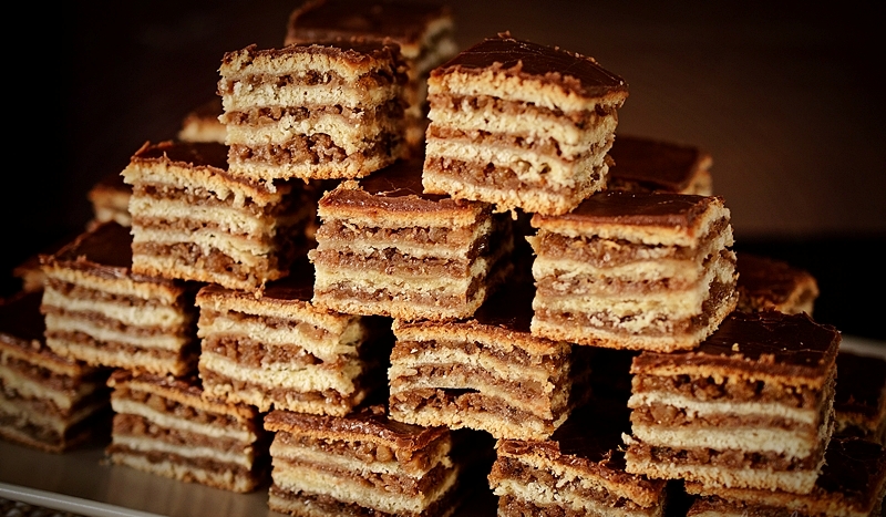 Foi: Se freacă drojdia cu zahărul până se lichefiază. Se adaugă untul la temperatura camerei, cele două ouă, pe rând, și se amestecă bine cu mixerul. Se toarnă apoi și smântâna, se adaugă coaja de lămâie și făina. Se amestecă puțin mai ușor și apoi se lasă aluatul la crescut cam 40 de minute. Aluatul pufos se împarte în 4 părți egale și se întind 4 foi cu grosimea de o jumătate de cm, pe hârtie de copt. Fiecare foaie se întinde pe hârtie de copt de aceeași mărime cu tava. Procedând așa, foaia se poate muta ușor în tavă fără să-și piardă forma. Se dezlipește foaia de pe hârtie după ce se așează în tavă. Se întinde destul de ușor. Nuca se amestecă cu zahărul vanilinat și zahărul tos. Se împarte în 3 părți egale. Se unge tava cu unt și se montează prăjitura punând o primă foaie peste care se întinde o parte din gem, se presară din amestecul de nucă cu zahăr și se continuă cu cealaltă foaie, și tot așa până la ultima care rămâne curată. Se lasă tava cu prăjitura la cald timp de 30 de minute să dospească și apoi se pune la cuptorul preîncălzit timp de o oră, la foc potrivit. Glazura lucioasă se toarnă peste prăjitura rece și se pregătește la cuptorul cu microunde punându-se toate ingredientele într-un castronel și se amestecă în ea, din 30 de secunde în 30 de secunde, până când se formează un sos gros.
