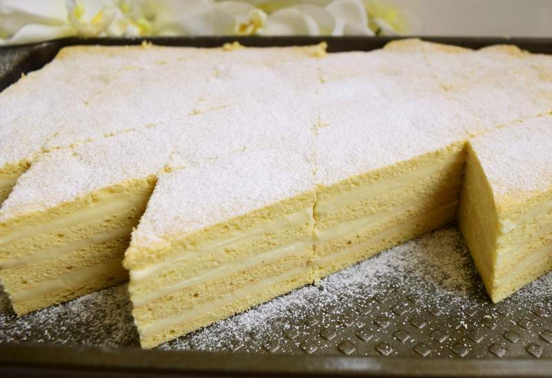 Pentru aluat, se amestecă ouăle cu un praf de sare și zahărul, apoi se adaugă uleiul, laptele și esența. Se amestecă o parte din făină cu praful de copt și bicarbonatul și se cern peste celelalte ingrediente. Apoi se pune și restul de făină și se frământă un aluat nelipicios care se lasă 15-20 de minute, acoperit cu un bol. După acest interval, se împarte aluatul în patru și se coc patru foi pe dosul unei tăvi de 24/36 cm, câte 3-4 minute, la 180 de grade. Pentru cremă, se amestecă într-un vas făina cu zahărul și puțin lapte rece și se omogenizează compoziția. Se adaugă și restul de lapte și se fierbe crema până se îngroașă ca o budincă. La final, se adaugă esența. Se pune la rece acoperită cu o folie direct, pentru a nu prinde crustă. Se mixează untul moale cu zahărul vanilinat și se încorporează în crema răcită, adăugând, după gust și zeamă de lămâie. Se împarte crema în trei și se întinde între foile de aluat coapte, se așează o greutate peste prăjitură și se lasă la rece de pe o zi pe alta. Se servește pudrată cu zahăr.