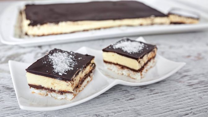 Se mizează spumă albușurile și treptat se adaugă zahărul până când se va obține o bezea tare. Se încorporează nuca de cocos, făina și praful de copt, amestecând cu o spatulă. Se toarnă compoziția obținută într-o tavă cu dimensiunea de 20 x 30 cm tapetată cu hârtie de copt. Se coace blatul la cuptorul preîncălzit la 170° C timp de aproximativ 15 minute. Se însiropează blatul copt cu 150 ml lapte. Pentru cremă, se pune 200 ml lapte împreună cu zahărul într-o crăticioară, la foc. Se amestecă laptele rămas cu zahărul vanilinat, praful de budincă de vanilie și gălbenușurile. Când amestecul din cratiță ajunge la punctul de fierbere, se adaugă compoziția cu gălbenușuri. Se gătește la foc mic, amestecând constant până când crema începe să se îngroașe, apoi se îndepărtează de pe foc. Se lasă crema deoparte, cât să se răcească, acoperită cu folie alimentară de plastic direct pe suprafață. La crema răcită complet se încorporează untul la temperatura camerei tăiat în cubulețe. Se distribuie uniform crema peste blatul copt și răcit, iar apoi frișca..