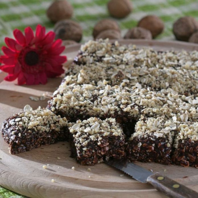 Se stinge focul și se întinde compoziția rezultată în strat uniform, într-o tavă tapetată cu folie de plastic. Se mărunțește miezul de nucă și se presară pe toată suprafața desertului.