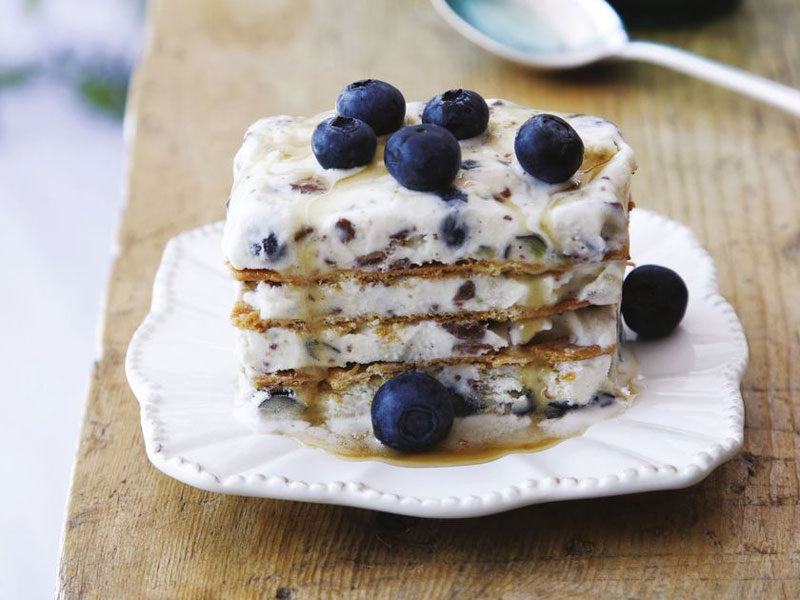 Se încălzește într-un vas 200 ml de smântână. Se adaugă ciocolata albă rasă şi se amestecă până se topeşte, se ia de pe foc și se pune vasul la frigider pentru câteva ore. Se bate smântâna rămasă cu zahărul vanilinat până devine frişcă, după care se amestecă cu crema de ciocolată. Se prepară gelatina conform instrucţiunilor de pe ambalaj şi se amestecă cu crema. La final, se adaugă o parte din afine și se amestecă. Se îmbracă o formă în folie alimentară şi se întinde un strat de cremă, după care unul de biscuiţi şi se alternează până când se termină ingredientele, deasupra fiind un strat de cremă. Pentru sirop, se topeşte zahărul într-o cratiţă, iar când devine auriu se toarnă apa. Se amestecă şi se dă deoparte.Se serveşte prăjitura cu sirop de zahăr ars şi decorată cu afine.