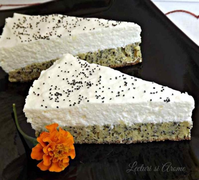13.Se toarnă peste blat crema de mascarpone și se pune prăjitura la rece până a doua zi când se dă deoparte inelul detașabil și se ornează simplu presărând semințe de mac pe deasupra.