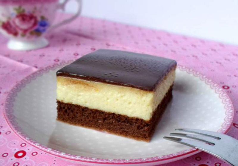 Pentru început se separă albșurile de gălbenușuri.Într-un bol, se mixează ingredientele uscate pentru stratul de jos (făină, cacao și praf de copt). Separat, se mixează albușurile cu un praf de sare. Într-un alt bol, se amestecă zahărul împreună cu gălbenușurile, apoi se adaugă compoziția de albușuri bătută spumă. Se încorporează amestecul de ingrediente uscate, iar în final se adaugă patru linguri de apă și se mixează bine până la omogenizare. Se toarnă compoziția obținută într-o tavă cu dimensiunile de 30×20 cm unsă cu unt și tapetată cu făină sau hârtie de copt. Se coace la cuptorul preîncălzit la 180° C pentru 20 de minute. Când este gata se poate însiropa cu puțin lapte.