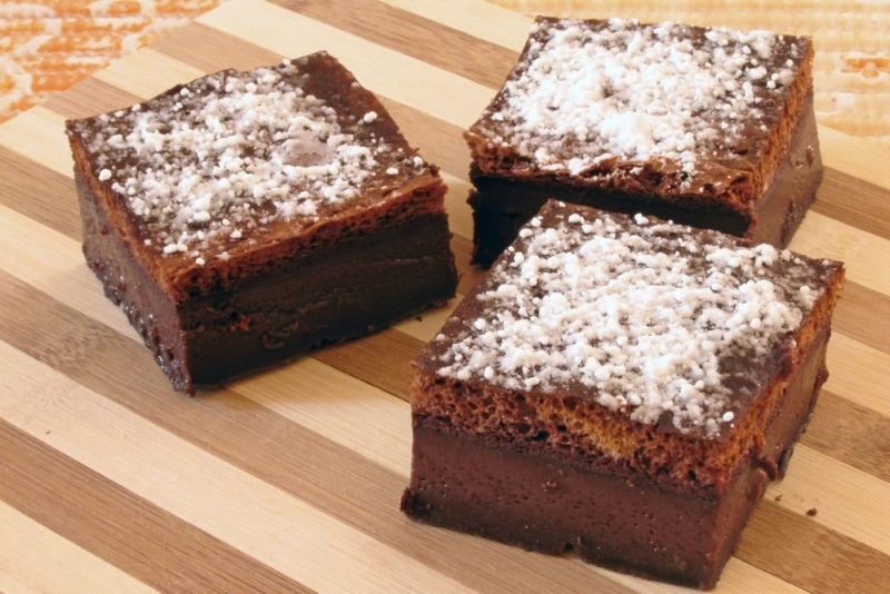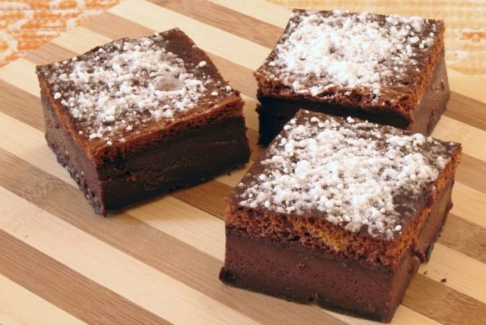 Se preîncălzeşte cuptorul la 160° şi se tapetează tava de prăjituri cu unt. Se alege o tavă nu foarte lată sau lungă, ideal pătrată, de 20/20 cm sau rotundă. Dacă aluatul nu este suficient de înalt în tavă, din pricina dimensiunilor acesteia, există riscul ca prăjitura inteligentă să nu se stratifice.Se separă albuşurile de gălbenuşuri. În castronul cu gălbenuşuri se adaugă lingura de apă, apoi zahărul. Se bat gălbenuşurile până când devin o cremă uşoară. Se adaugă untul, praful de sare şi esenţa de vanilie, apoi se continuă să se mixezeze până când crema devine pufoasă. Se combină făina cu cacaua şi se adaugă treptat peste gălbenuşuri, amestecând bine după fiecare tranşă. Se adaugă laptele puţin câte puţin, amestecând în tot acest timp, iar după ce se încorporează complet, textura trebuie să fie destul de lichidă. Se bat albuşurile spumă împreună cu oţetul şi se mixează până când albuşul se ţine de paletele mixerului. Se adaugă spuma de albuşuri în compoziţia cu cacao, puţin câte puţin, amestecând delicat cu o spatulă. Nu e necesar să se omogenizeze amestecul. Se pune aluatul în tava pregătită şi se coace pentru 60 de minute. Este normal ca prăjitura să fie puţin mai moale în mijloc, să se mişte uşor, motiv pentru care trebuie lăsată să se răcească înainte de a fi tăiată. Se ornează prăjitura cu cacao sau cu zahăr pudră înainte de servire.