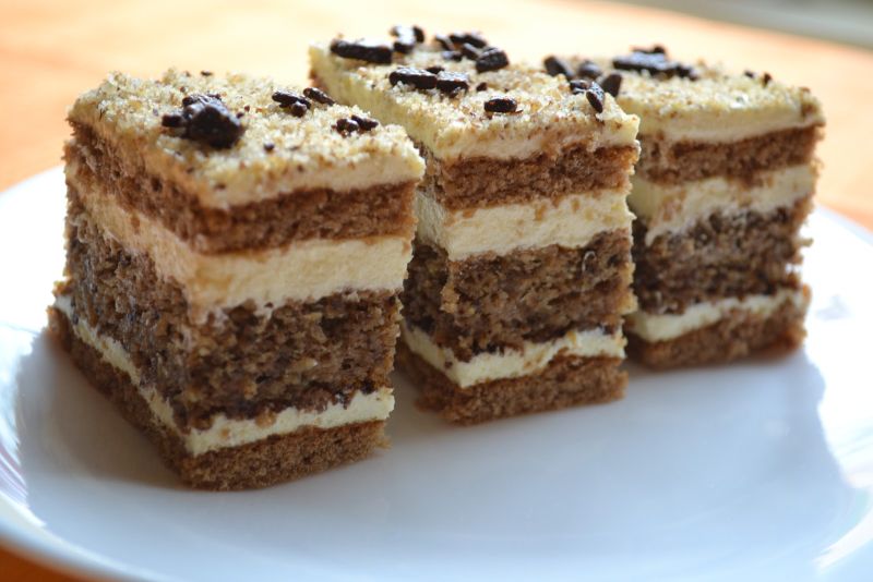 Se aşează 1 foie de pandişpan şi se unge cu 1/2 din cremă, peste care se pune blatul cu nucă, cealaltă jumătate de cremă, apoi cea de-a doua foaie de pandişpan, care se unge cu cele 2 linguri de cremă rămase. Deasupra se presară nucă şi bucăţele de ciocolată.