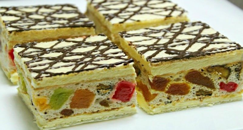 Prepararea blatului. Se mixează albuşurile cu un praf de sare până devin spumoase. Treptat se adaugă zahărul şi se mixează până se obţine o bezea tare şi lucioasă. Făina se amestecă cu praful de copt şi se adaugă peste compoziţia de bezea, apoi se amestecă uşor cu mişcări de sus în jos. Rahatul se toacă mărunt şi se adaugă în compoziţie, apoi se adaugă pe rând nuca prăjită şi fructele confiate, apoi se amestecă bine să se omogenizeze perfect toate ingredientele. Compoziţia obţinută se toarnă într-o tavă cu dimensiunea 20×30 cm, unsă cu ulei şi tapetată cu hârtie de copt. Se pune tava în cuptor pentru circa 25-30 de minute la 180˚C. După ce blatul este copt se scoate tava din cuptor şi se lasă blatul să se răcească.