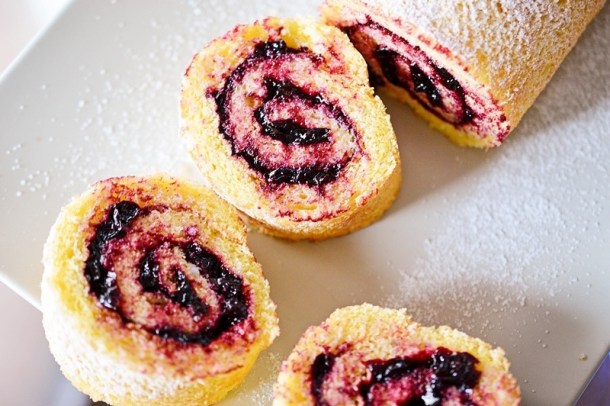 Se separă albușurile de gălbenușuri și se pun în două vase separate. Se adaugă zahărul peste gălbenușuri și semințele păstăii de vanilie și se mixează până când se deschid la culoare și își dublează volumul. Se adaugă sarea peste albușuri și se mixează până când nu mai cad de pe paletele mixerului. Se adaugă, în 2-3 tranșe, gălbenușurile peste albușuri și se amestecă cu grijă, de jos în sus. Se cerne făina direct peste compoziția obținută. Se amestecă din nou, cu grijă, de jos în sus, până la omogenizare. Se tapetează o tavă cu puțin unt și hârtie de copt și se adaugă compoziția. Se nivelează cu grijă și se coace rulada în cuptorul preîncălzit la 180°C, pentru 10-12 minute. Se răstoarnă blatul de ruladă pe o hârtie de copt umedă și se îndepărtează cu grijă foaia de copt caldă. Se înfășoară cu grijă în hârtia de copt umedă, se strâng capetele și apoi se învelește ruloul într-un șervet de bumbac umed. Se lasă rulada să se răcească complet, apoi se elimină șervetul și hârtia de copt. Se unge suprafața ruladei cu gemul de afine și se rulează cu grijă. Se învelește rulada în folie de plastic alimentară și se pune în frigider pentru 30 de minute. Se ornează rulada cu ciocolată albă topită și fructe, afine și zmeură sau se pudrează cu zahăr vanilinat.