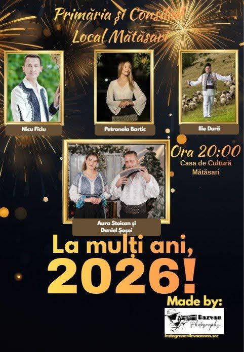 Primăria și Consiliul Local al comunei Mătăsari îi invită pe toți locuitorii să sărbătorească trecerea în Anul Nou 2026 într-un cadru festiv, plin de tradiție, muzică și voie bună.