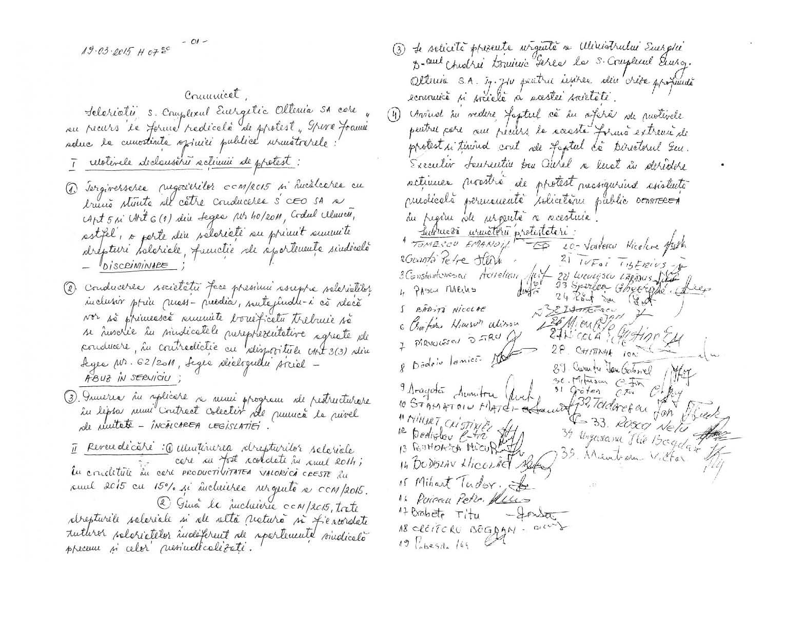 Greviştii de la CEO au redactat pe două coli de hârtie, în această dimineaţă, care le sunt revendicările lor şi motivele pentru care sunt, de patru zile, în refuz de hrană. Documentele vor fi transmise Instituţiei Prefectului Judeţului Gorj şi ministrului Energiei, cu care o parte dintre grevişti se întâlnesc în mai puţin de trei ore, la Bucureşti.