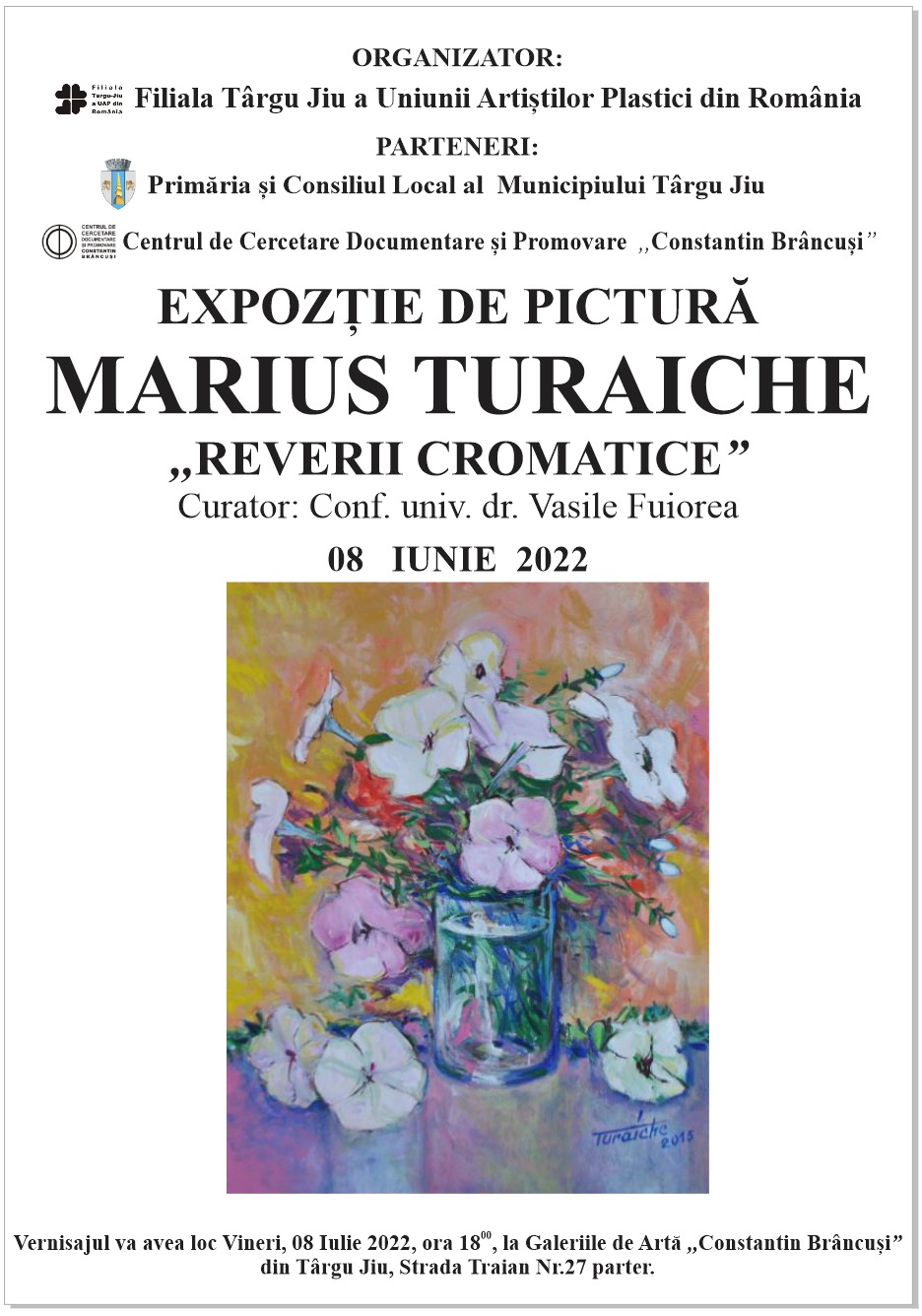 Filiala Târgu Jiu a Uniunii Artiștilor Plastici din România, în parteneriat cu Primăria Municipiului Târgu Jiu și Centrul de Cercetare Documentare și Promovare „Constantin Brâncuși”, organizează vineri, 8 iulie, ora 18.00, la Galeriile de Artă „Constantin Brâncuși”  din Târgu Jiu, strada Traian nr. 27, parter, vernisajul expoziției personale de pictură „Reverii cromatice”, a artistului Marius Turaiche, membru al UAP din România, Filiala Craiova.