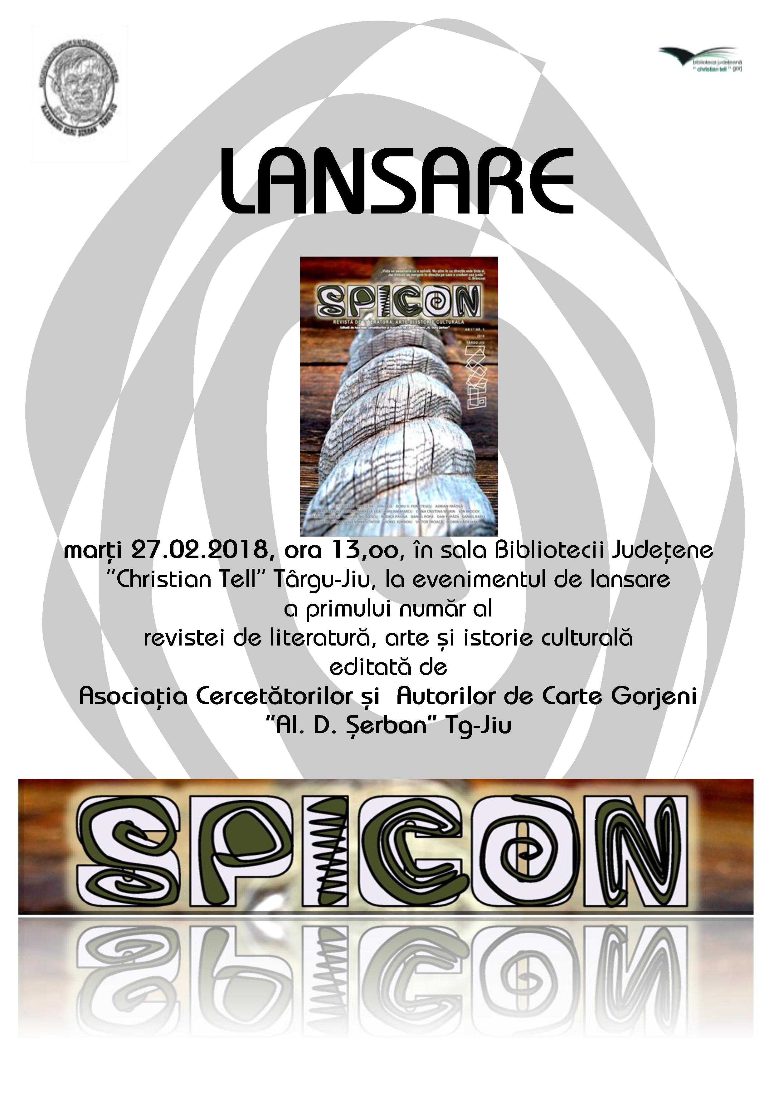 Primul număr al revistei de literatură, arte și istorie culturală, ”SPICON”, editată de Asociația Cercetătorilor și Autorilor de Carte Gorjeni ”Al. D. Șerban” Târgu Jiu se va lansa marţi, la ora 13.00, în sala Bibliotecii Județene ”Christian Tell”.