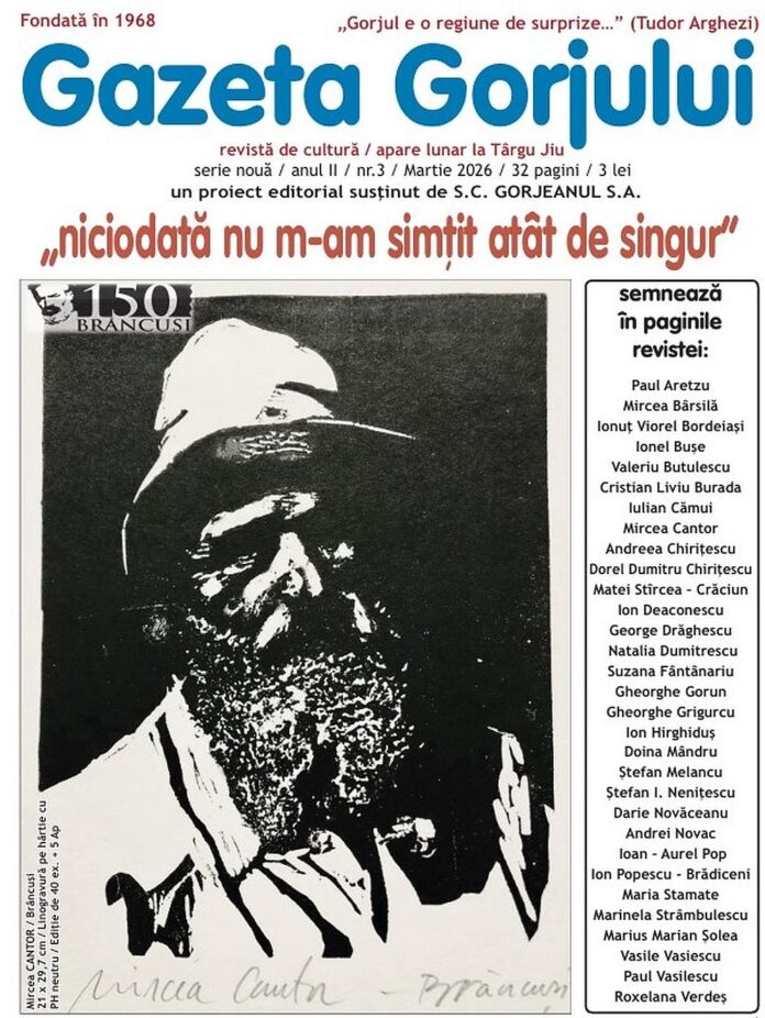 Noul număr al revistei – o ediție de 32 de pagini (serie nouă, anul II, nr. 3), apărută în martie 2026 – a fost realizat la Târgu Jiu în cadrul unui proiect editorial susținut de S.C. Gorjeanul S.A., prin implementarea inițiativei medi@rt.vasiescu.