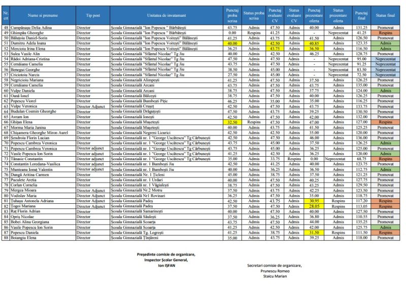 Cei șase candidați care au formulat contestație, după ce au participat la concursul pentru ocuparea posturilor vacante de director şi director adjunct din unităţile din învăţământul preuniversitar, nu au primit vestea pe care o așteptau. ”Nu s-a schimbat situația inițială, în urma contestațiilor”, a declarat Georgeta Popescu, purtătorul de cuvânt al Inspectoratului Școlar Județean Gorj. În total, 61 de persoane s-au înscris în competiţie, fiind declarat “promovat” candidatul “admis” care a obţinut cel mai mare punctaj total. Acestea au formulat 86 de opțiuni, la mai multe școli, fiind vacante 32 de posturi de