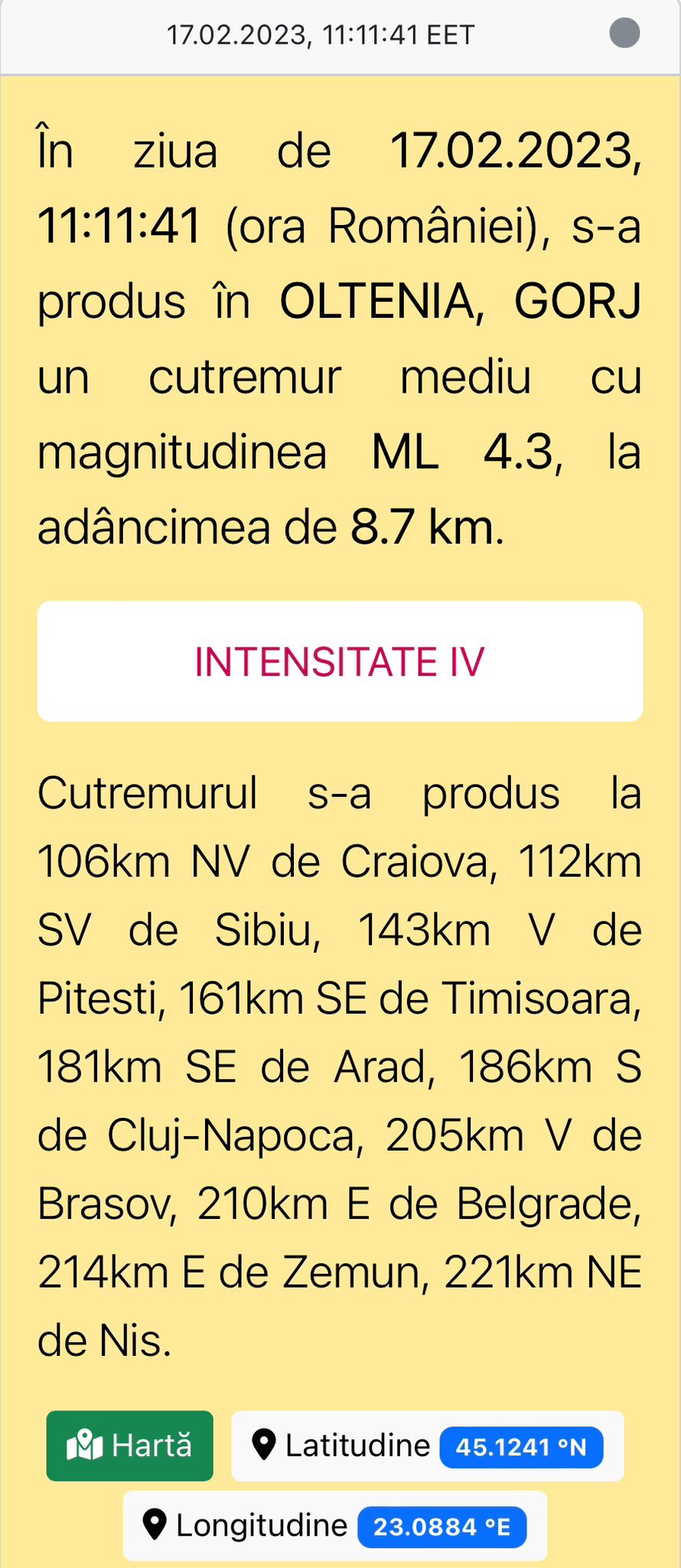 ISU Gorj: În județul Gorj s-a produs un cutremur cu magnitudinea de 4.3, la adâncimea de 8,7 km. ( INFP a revizuit notificarea, n.r).