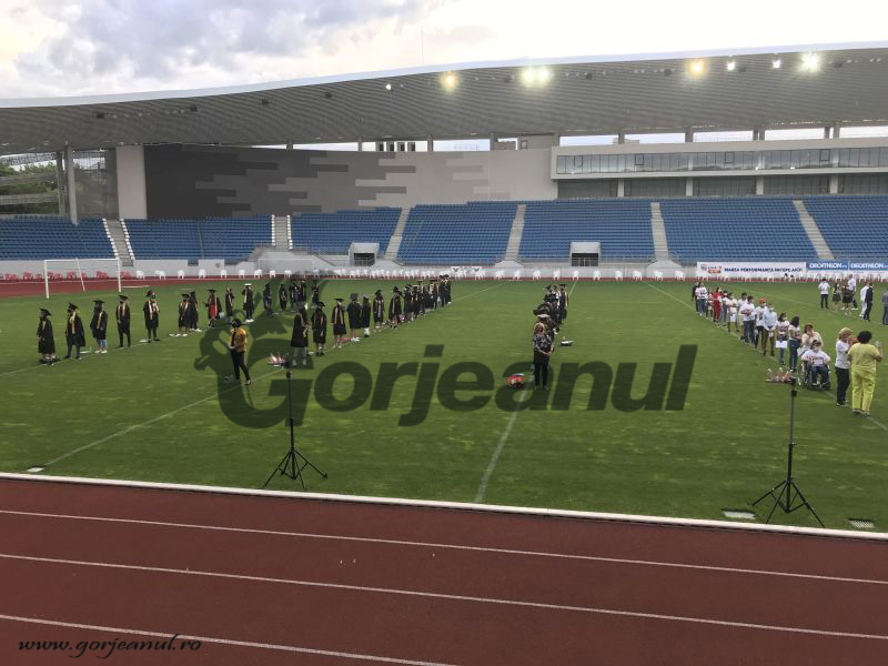 De marți încoace absolvenții de gimnaziu din municipiu au parte de festivități speciale, organizate la stadionul de 25 de milioane inaugurat anul trecut și pe care numai meciuri de fotbal nu s-au jucat până acum. În fiecare după-amiază, chiar spre seară, în funcție de temperaturi și starea vremii, absolvenții școlilor, în baza unor programări anterioare, participă la festivitățile organizate sub stricta supraveghere a autorităților sanitare. Inspectorii Direcției de Sănătate Publică Gorj măsoară temperatura fiecărei persoane care intră în incinta stadionului, asigurându-se că nu se strecoară printre participanți cineva cu stare febrilă, simptom al unei posibile infecții cu COVID-19. Elevii vin oricum la intervale mari de timp, în funcție de școala pe care au absolvit-o, iar pe pista de atletism sunt așteptați cu scaune amplasate la 2 metri distanță unul de celălalt. În tribune stau părinții, dar și ei trebuie să respecte regulile de distanțare socială, așa că numărul participanților pare unul destul de redus, dată fiind capacitatea mare a stadionului.
