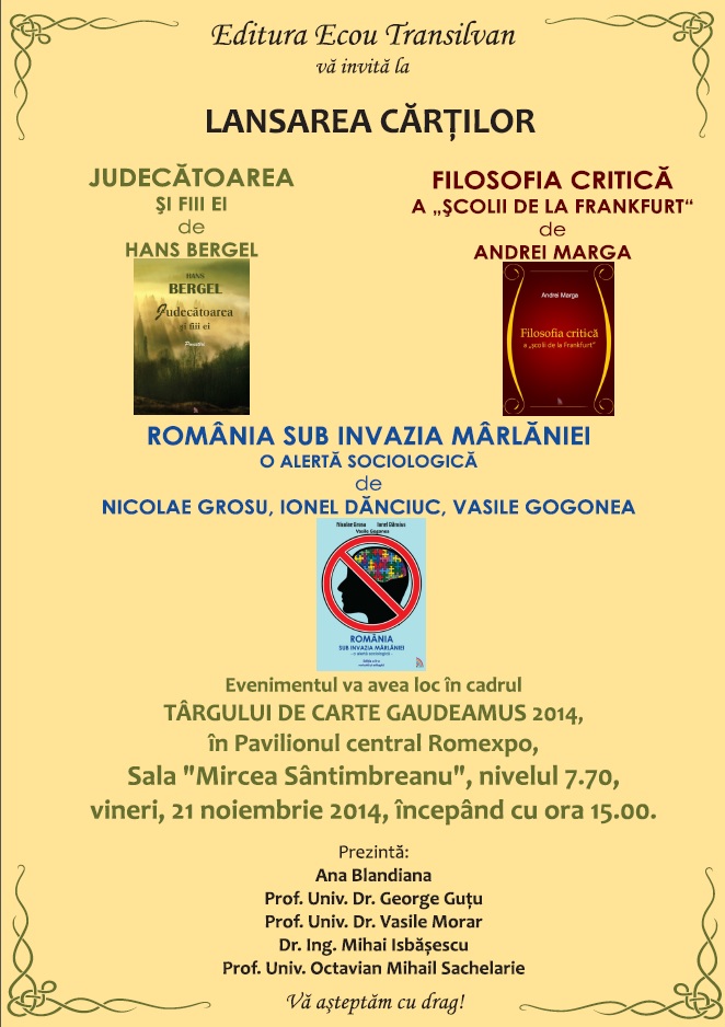 Să reținem faptul că vineri, 21 noiembrie 2014, ora 15.00, în sala «Mircea Sântimbreanu», nivelul 7.70, îndrăgita Editură “Ecou Transilvan”, prin managerul său de carte, Nadia Baciu, a organizat lansarea volumelor “Judecătoarea și fiii ei”, autor Hans Bergel, “Filosofia critică a școlii de la Frankfurt”, autor Andrei Marga și “România sub invazia mârlăniei” – o alertă sociologică – ediția a II-a adăugită și revizuită, autori Nicolae Grosu, Ionel Dănciuc, Vasile Gogonea. Cele trei cărți au fost prezentate de: Ana Blandiana, Prof. Univ. Dr. George Guțu, Prof. Univ. Dr. Vasile Morar, Dr. Ing. Vasile Isbășescu, Prof. Univ. Octavian Mihail Sachelarie!