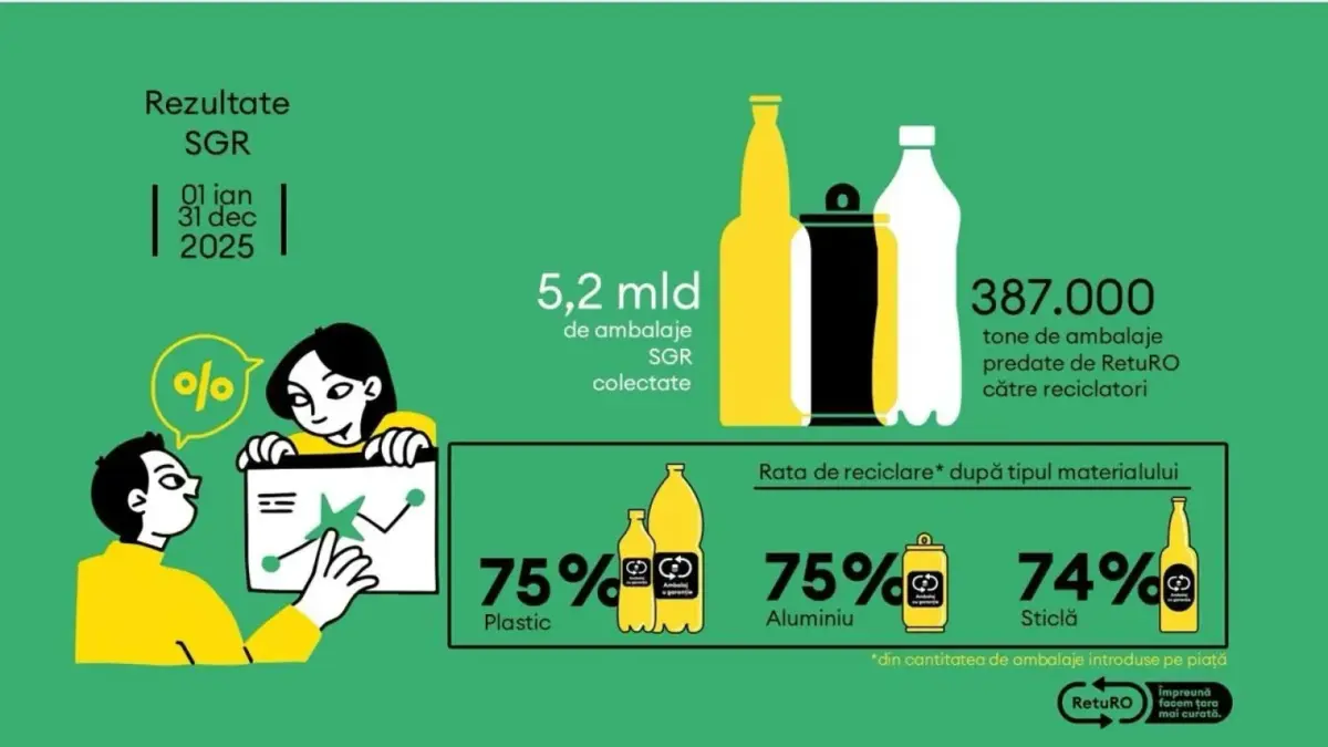 Astfel, în 2025, rata de colectare a atins 83%. „Acest rezultat reflectă implicarea tot mai mare a consumatorilor și nivelul ridicat de încredere în funcționarea sistemului. Peste 350 de milioane de ambalaje au fost colectate în luna decembrie, rata lunară de returnare fiind de aproximativ 72%. Astfel, rezultatele aferente anului 2025 confirmă maturitatea operațională a sistemului și adoptarea sa pe scară largă„, se arată într-un comunicat al RetuRO.