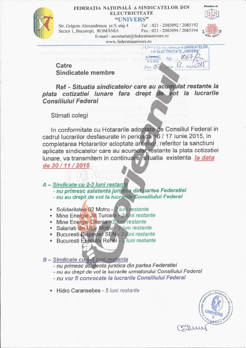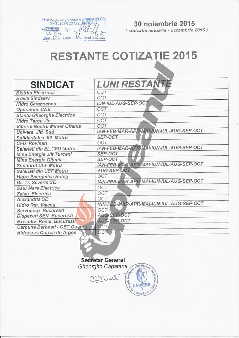 Restante cotizatie la 30.11SMEO şi Sindicatul Mine Energie Jilţ Turceni, fără drept de vot la Congres